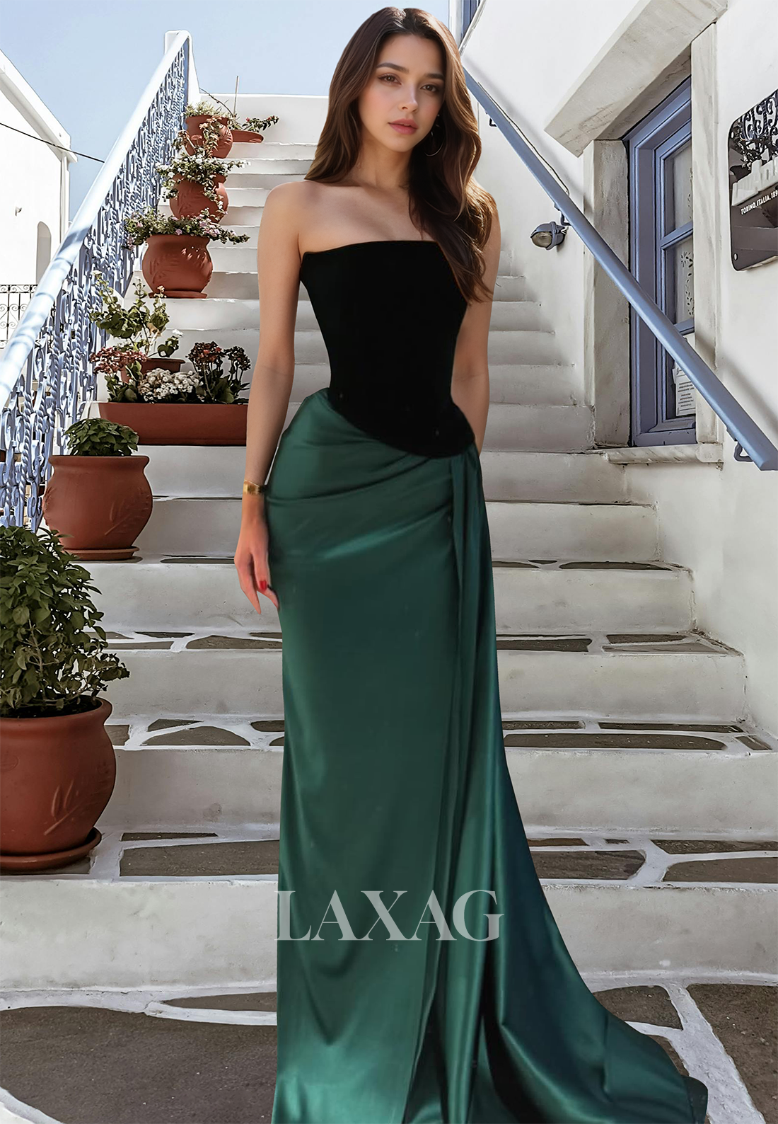 Off-Shoulder Sleeveless Pleated Satin Formal Gowns Tube Top Sweep Train Mermaid Prom Dress