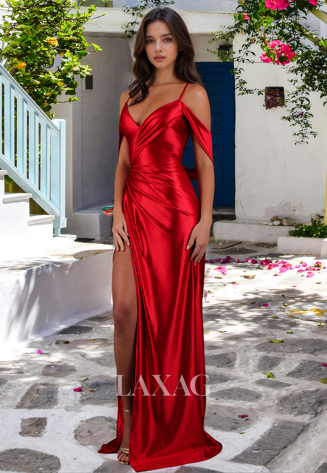 Spaghetti Straps V-Neck Sleeveless Mermaid Prom Dress Off-Shoulder Pleated Formal Gowns with High Slit