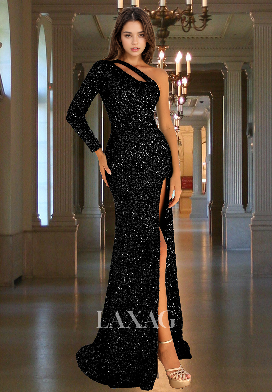 Asymmetrical-Neck One-Long-Sleeve Fully Sequined Cutout High Slit Sweep Train Mermaid Prom Dress