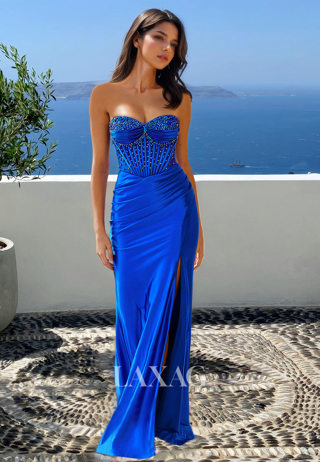 Beaded Sweetheart Off-Shoulder Sleeveless Pleated Floor-Length Mearmaid Prom Dress with Slit