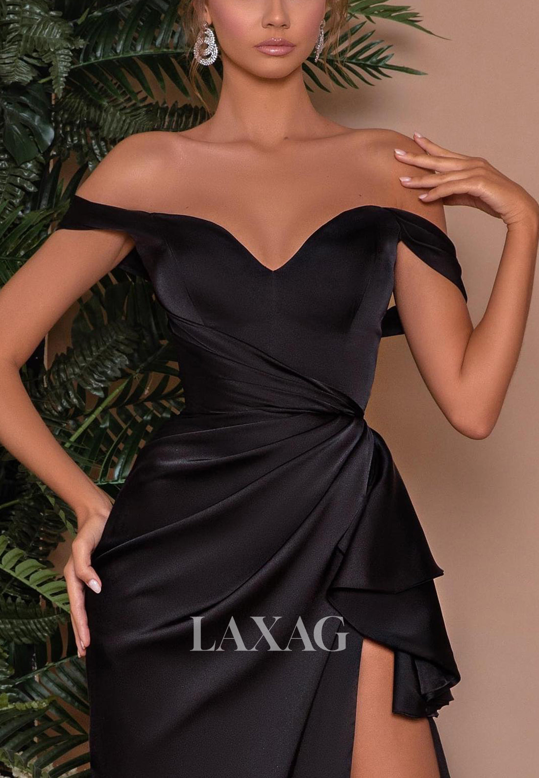 Off Shoulder Black Ruched Evening Prom Dress With Slit