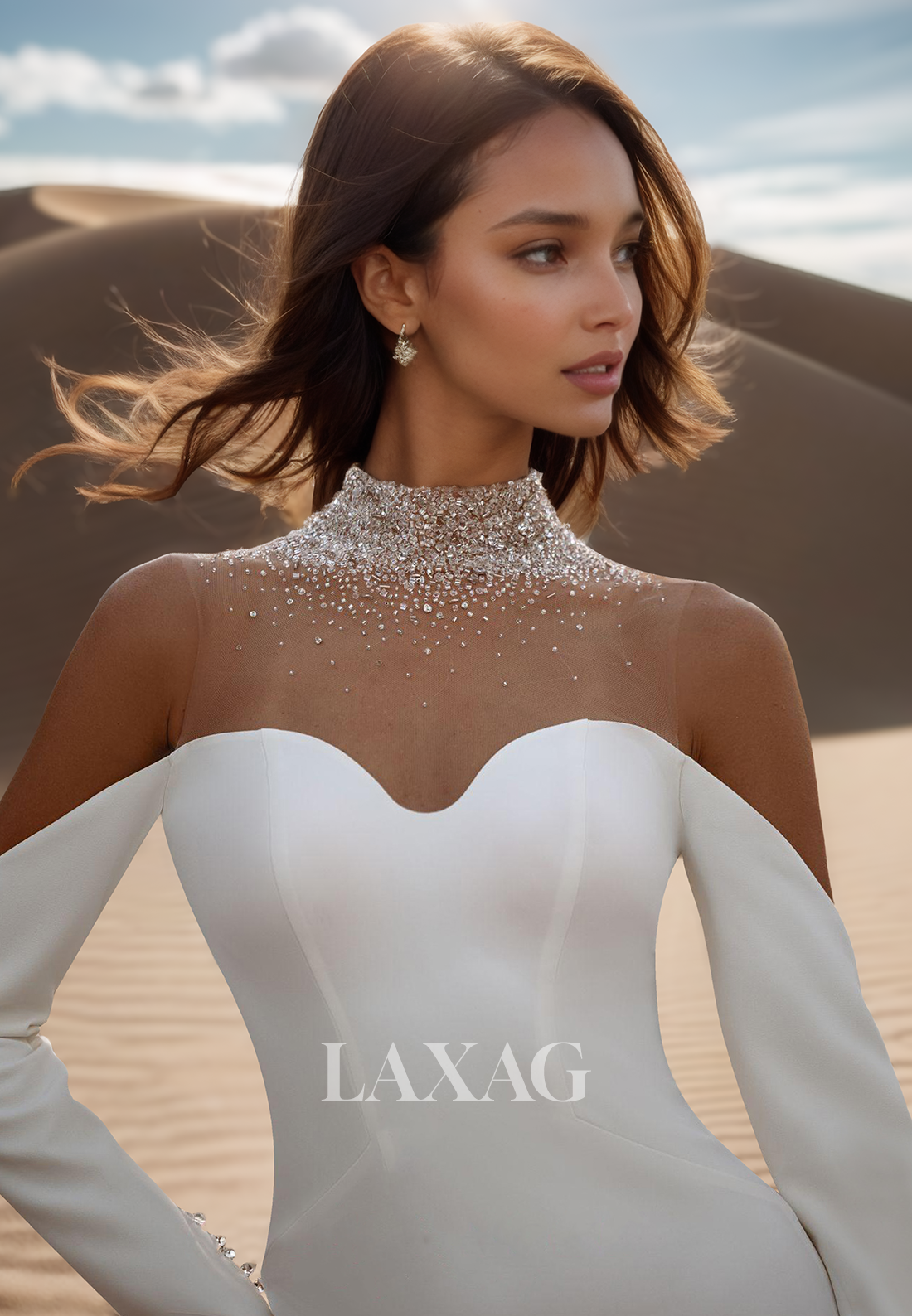 The Beaded High-Neck Sweetheart Long Sleeves Bride Gowns offer a modern and elegant look for any bride-to-be. The beaded detailing and pleated design add a touch of sophistication, while the sweep train and mermaid silhouette create a flattering shape. Made from high-quality satin, this dress is both comfortable and luxurious. A perfect choice for a stylish and sophisticated wedding.