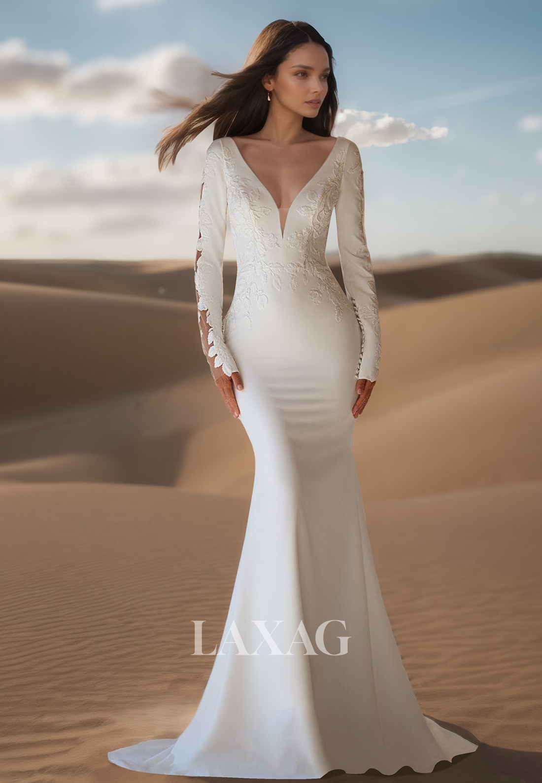 Long Sleeves Deep V-Neck Pleated Mermaid Wedding Dress Lace Applique Sweep Train Bride Gowns