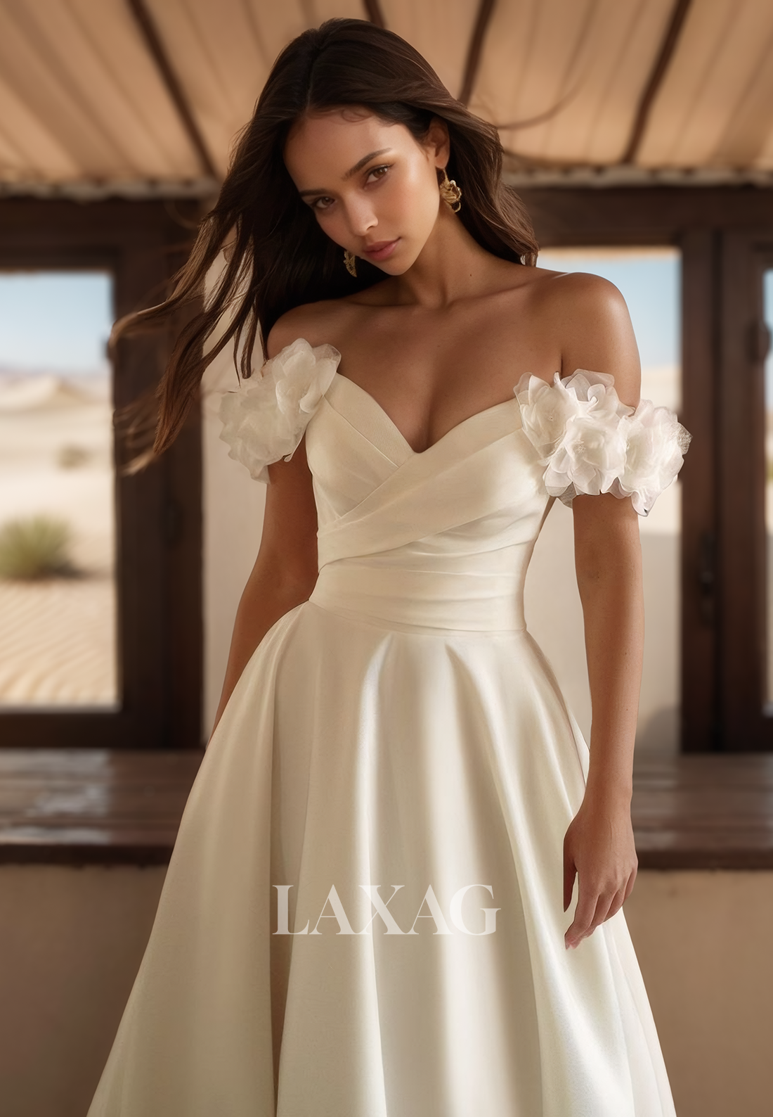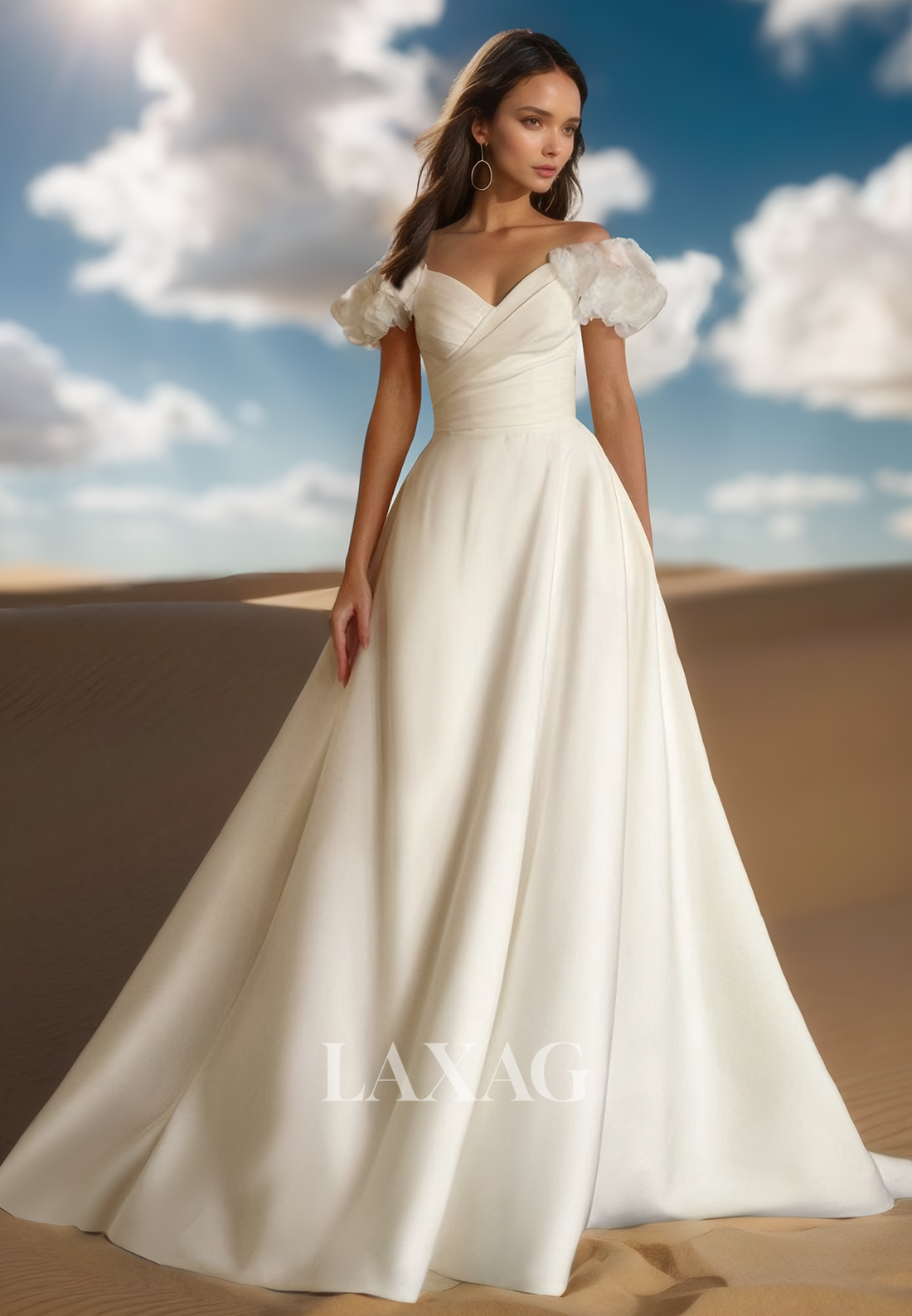 V-Neck Off-Shoulder Sleeveless Satin Bride Gowns Pleated Satin A-Line Wedding Dress