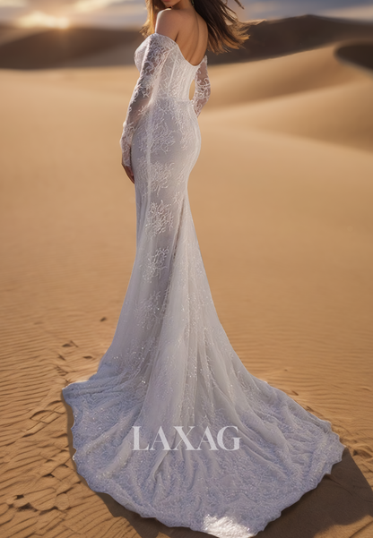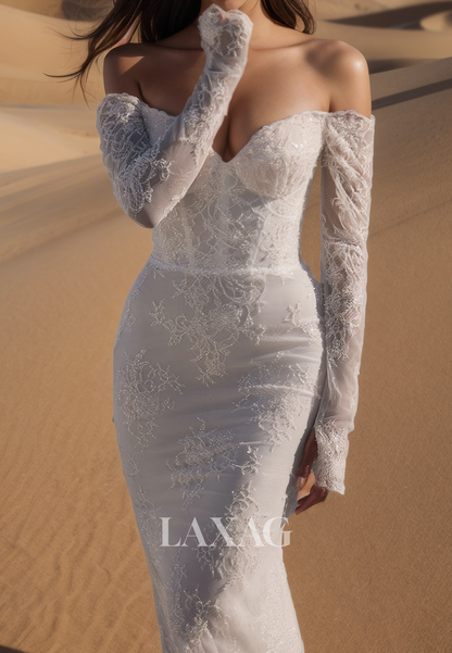 Sweetheart Long-Sleeves Allover Lace Applique Pleated Bride Gowns Off-Shoulder Mermaid Wedding Dress