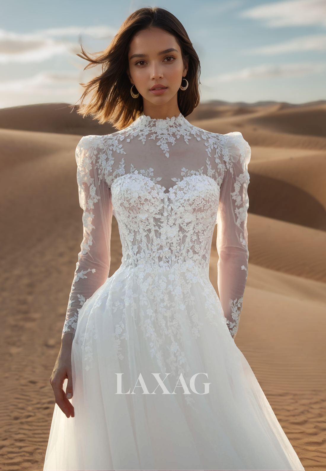 High-Neck Long-Sleeves Lace Applique Pleated Sheer Tulle A-Line Wedding Dress with Train