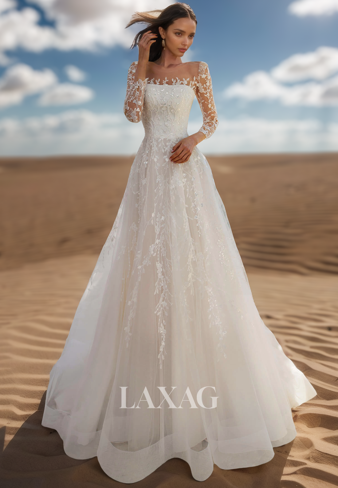 Elevate your wedding look with this stunning Tube Top Applique Beaded Pleated A-Line Wedding Dress. The intricate applique and beadwork add a touch of glamour, while the pleated A-line silhouette flatters any figure. The long-sleeves and sweep train give a timeless elegance, making this the perfect choice for any bride.