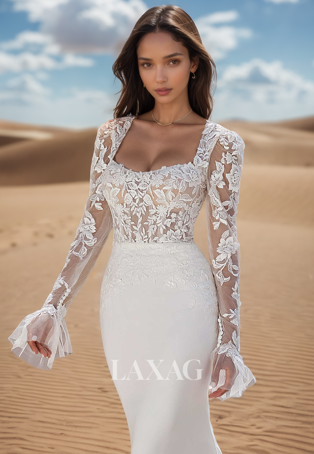 Square-Neck Long-Sleeves Tulle&Satin Bride Gowns Lace Applique Sequined Mermaid Wedding Dress