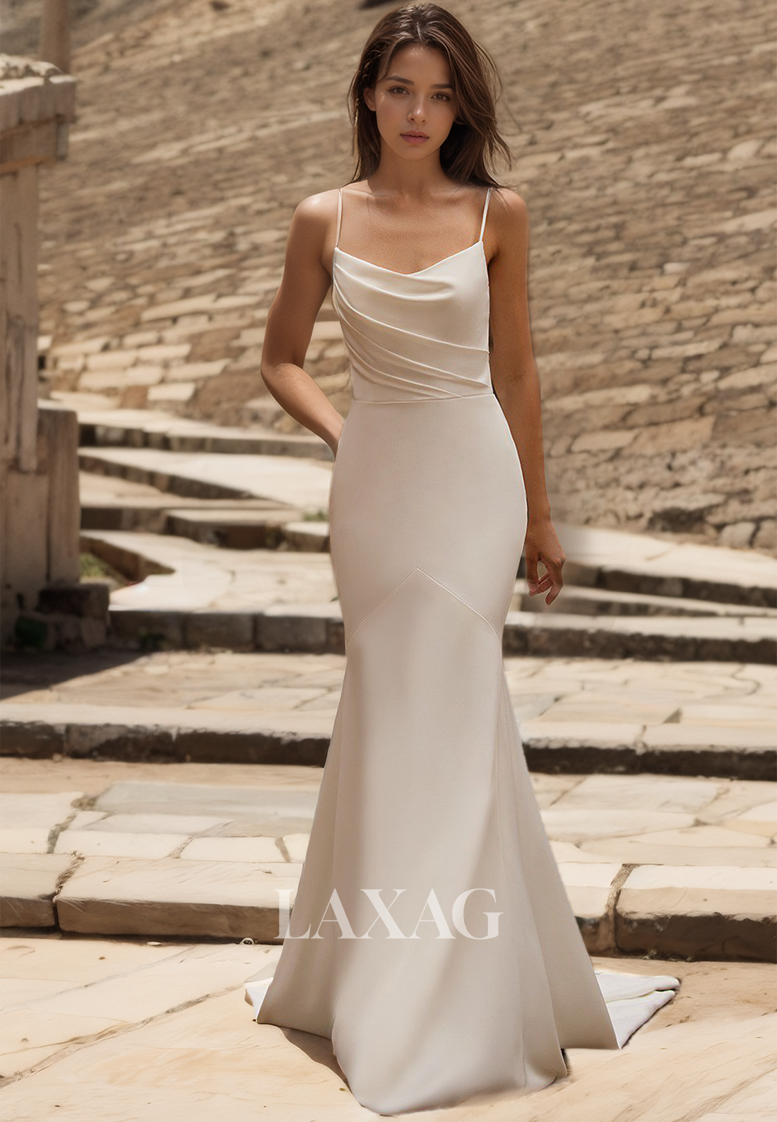 This elegant mermaid wedding dress features a tube top, spaghetti straps, pleated satin fabric, and a train. Perfect for brides seeking a sleek and sophisticated look. The smooth satin fabric and pleats enhance the silhouette, while the train adds a touch of glamour.