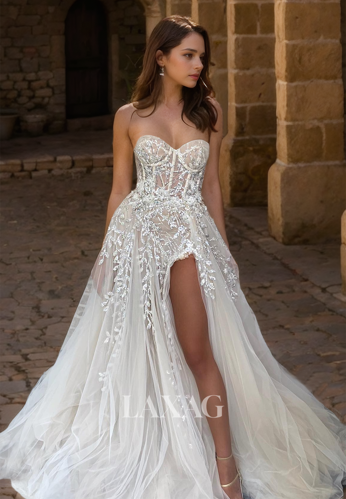 Expertly crafted with tulle, this A-Line wedding dress features a sweetheart neckline and a sleeveless design. Embellished with intricate beading and applique details, it also boasts a daring slit train. Perfect for a beach bride looking for a romantic and elegant gown.