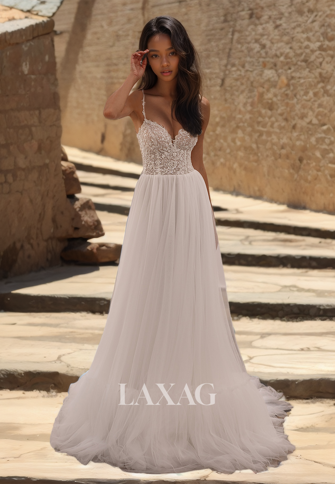 Spaghetti Straps Sleeveless A-Line Bride Gowns Sweetheart Off-Shoulder Beaded Tulle Wedding Dress