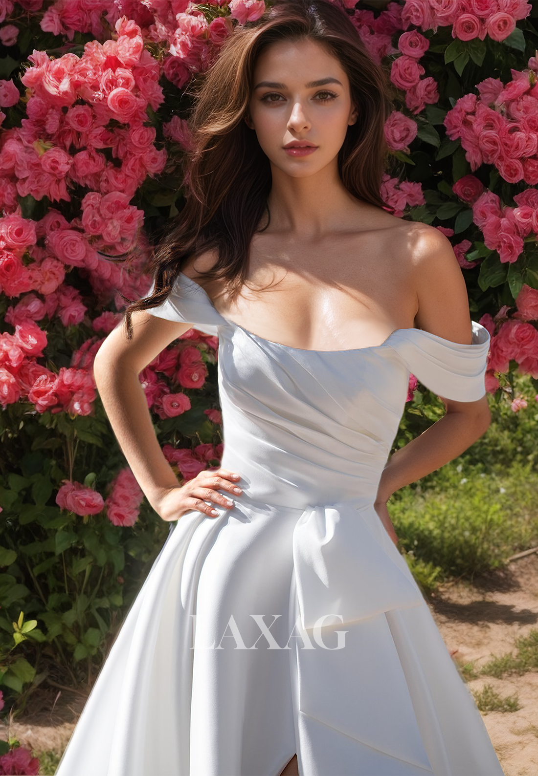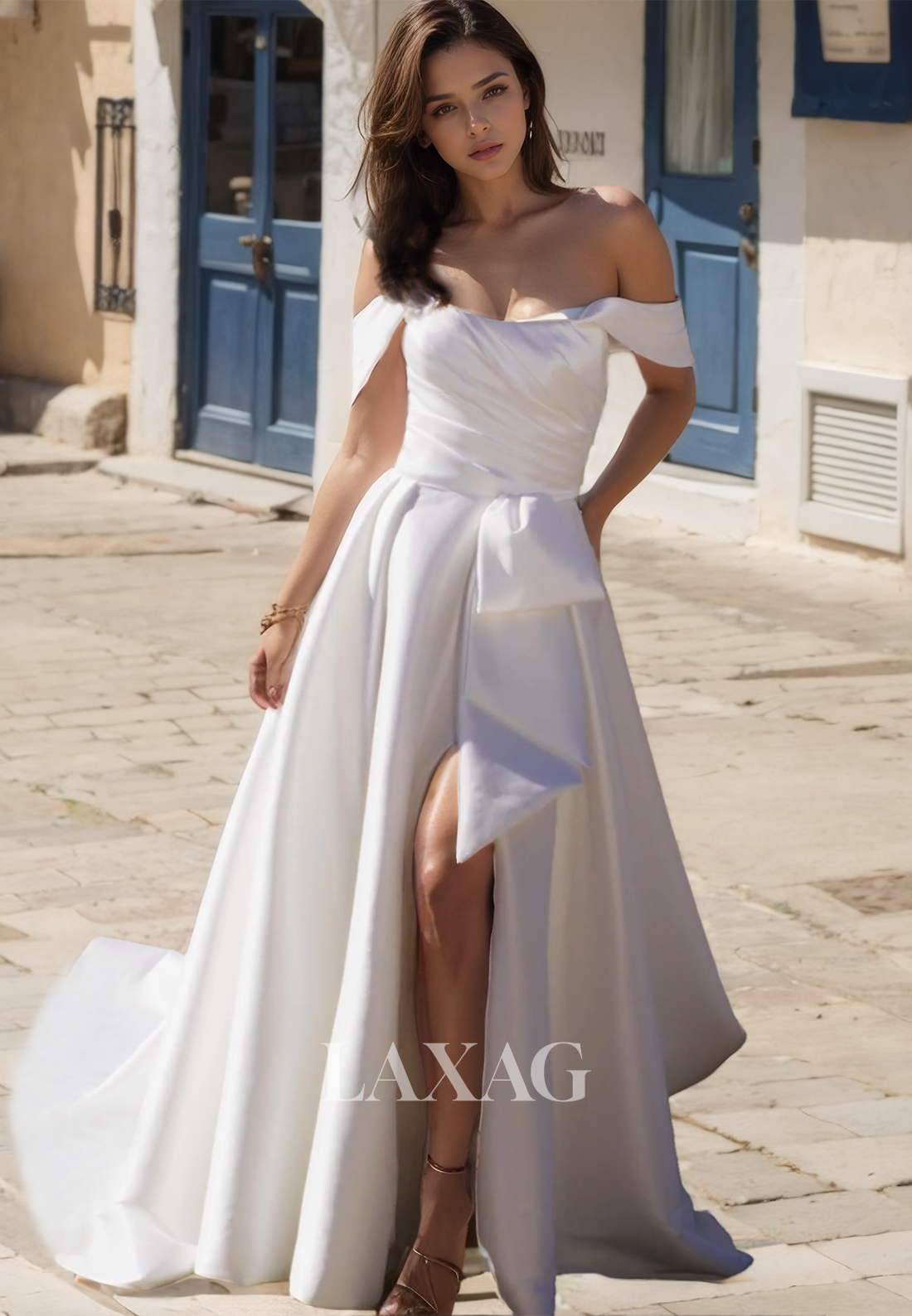 Tube Top Sleeveless Off-Shoulder Pleated High Slit Satin A-Line Wedding Dress with Train
