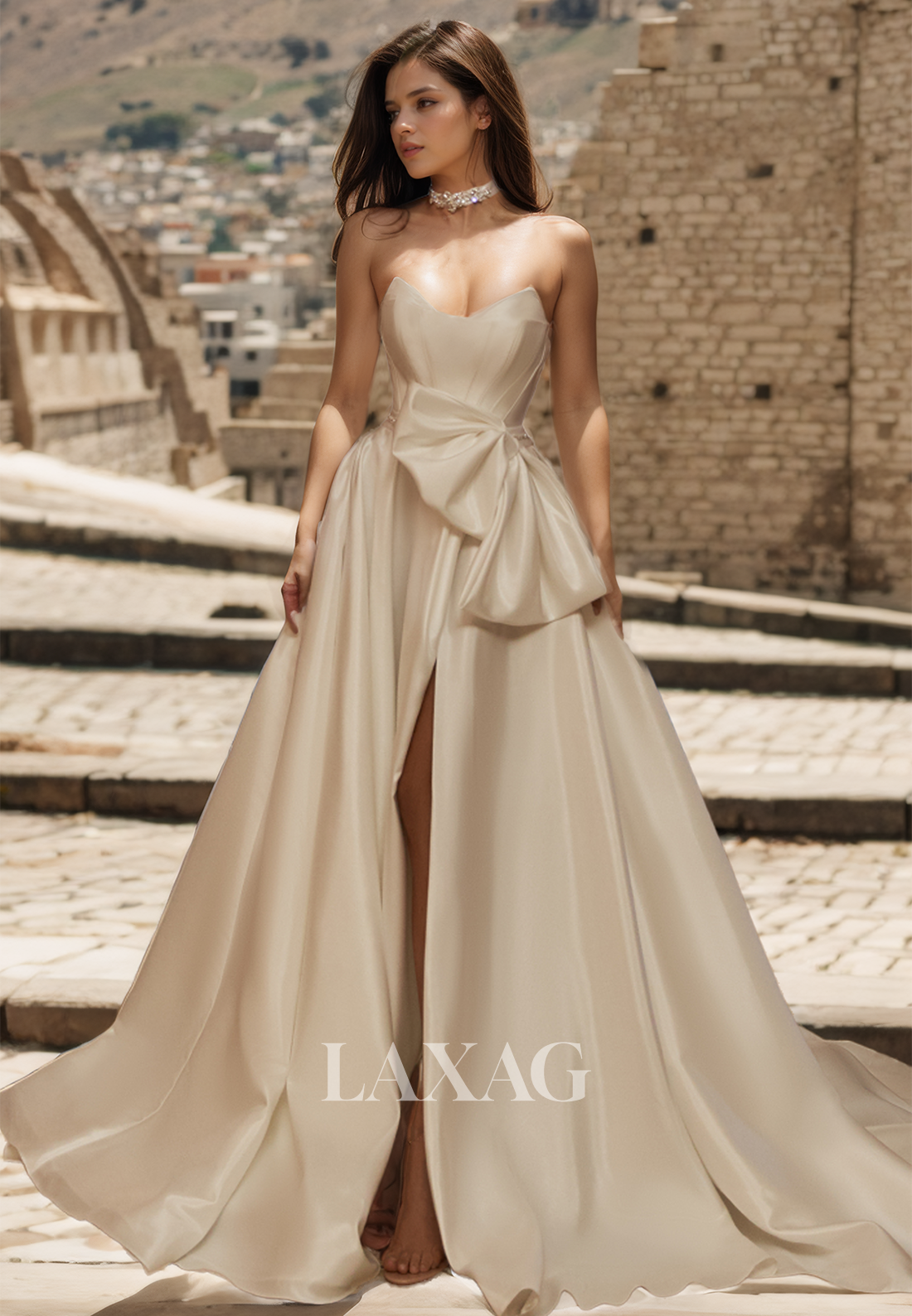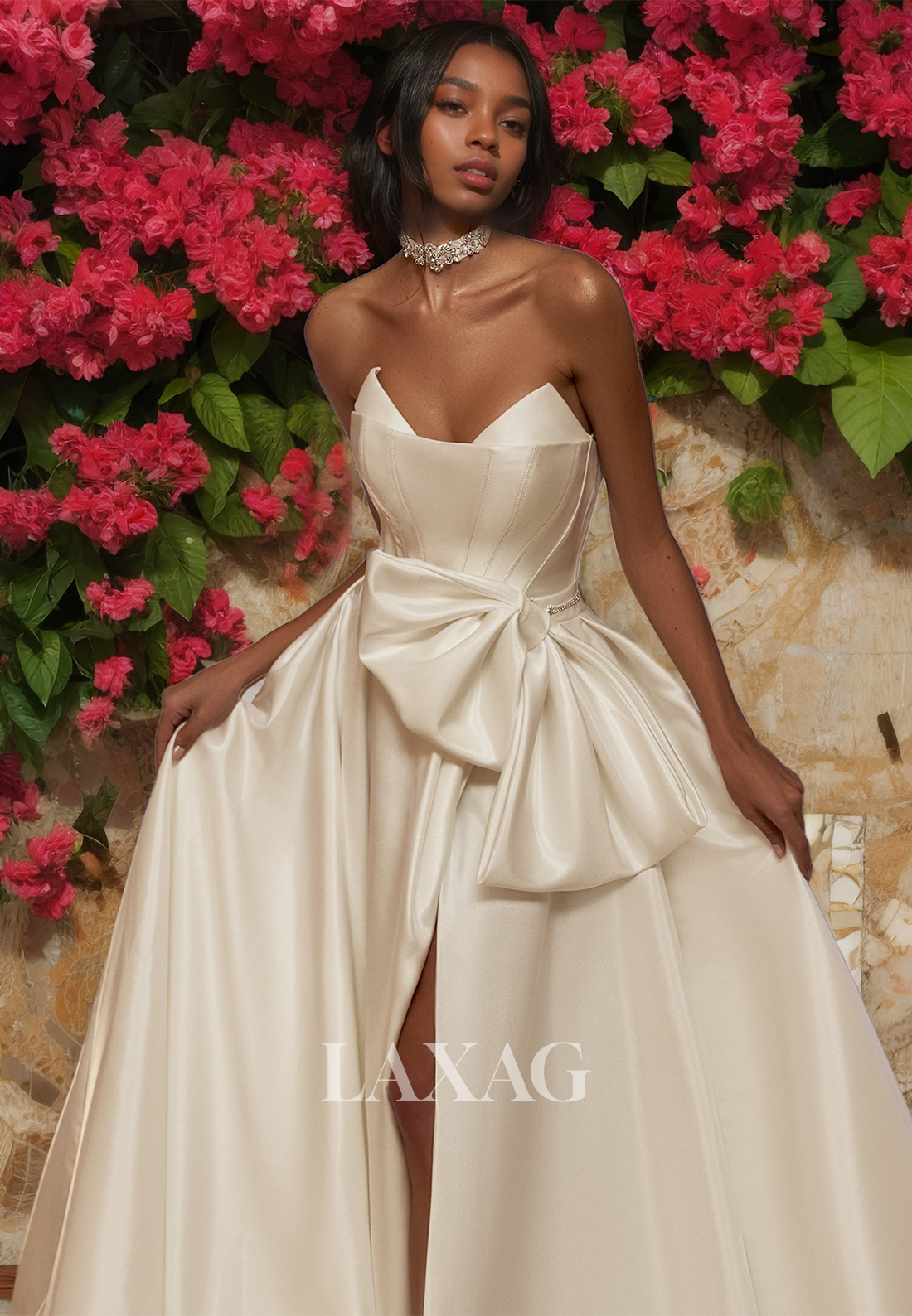 Expertly crafted with a V-neck, off-shoulder design and A-line silhouette, this wedding dress exudes elegance and sophistication. The pleated details and high slit add a touch of drama, while the big bows add a playful and romantic touch. Perfect for any bride looking for a stunning and unique gown.