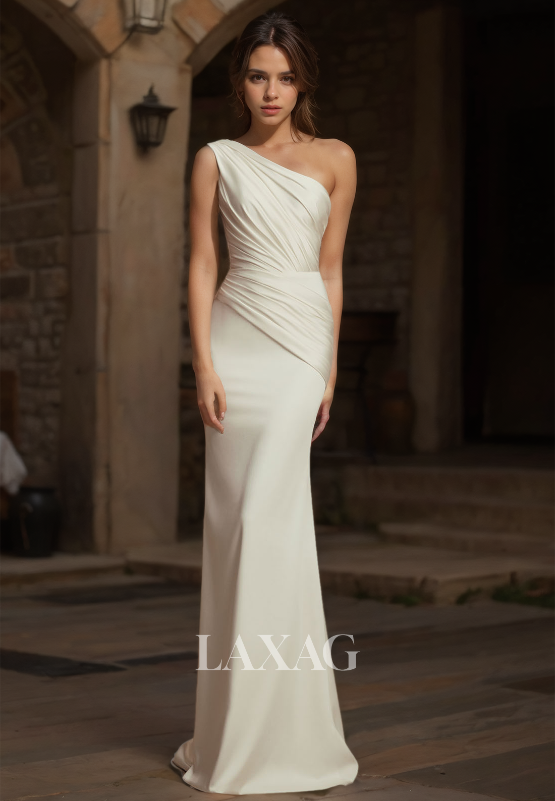 Asymmetrical-Neck Sleeveless Mermaid Bride Gowns Off-Shoulder Pleated Wedding Dress with Train
