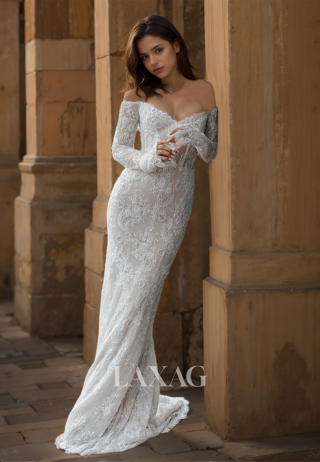Sweetheart Beaded Mermaid Wedding Dress Long-Sleeves Applique Bride Gowns with Sweep Train