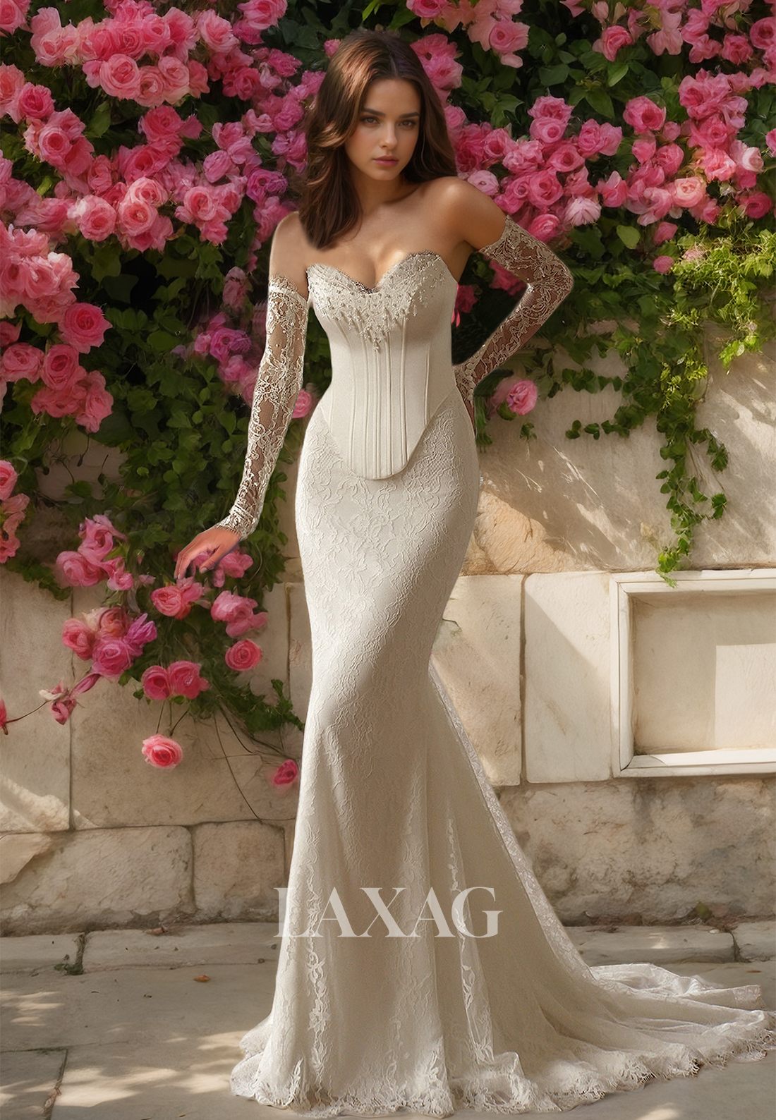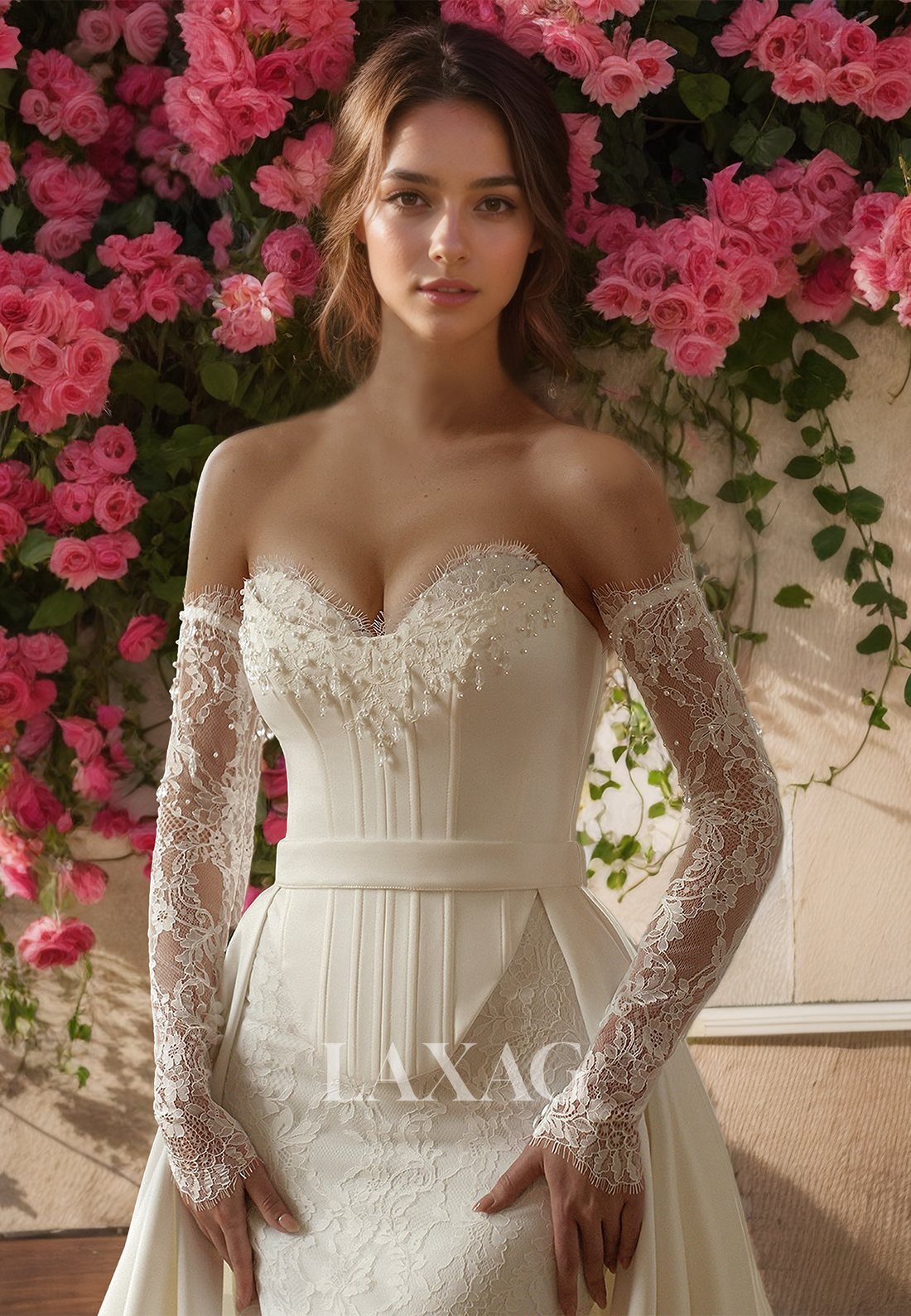 Long-Sleeves Sweetheart Mermaid Wedding Dress Allover Lace Beaded Sweep Train Bride Gowns with Overskirt