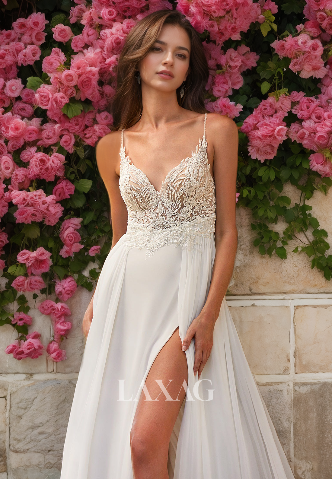 This stunning V-neck wedding dress features delicate spaghetti straps, a sleeveless design, and intricate applique details. The cutout train adds a touch of elegance and femininity to the A-line silhouette. Expertly crafted for the modern bride, this gown is sure to make a statement on your special day.