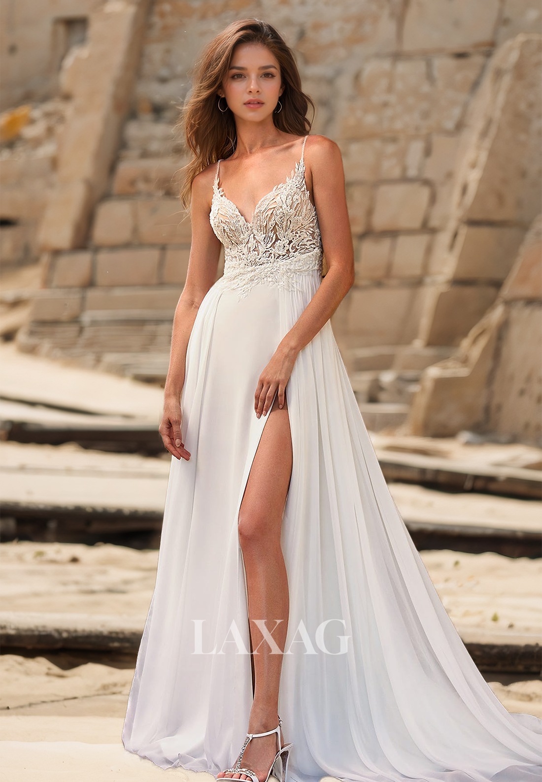 V-Neck Spaghetti Straps Sleeveless Bride Gowns Applique Cutout Train A-Line Wedding Dress