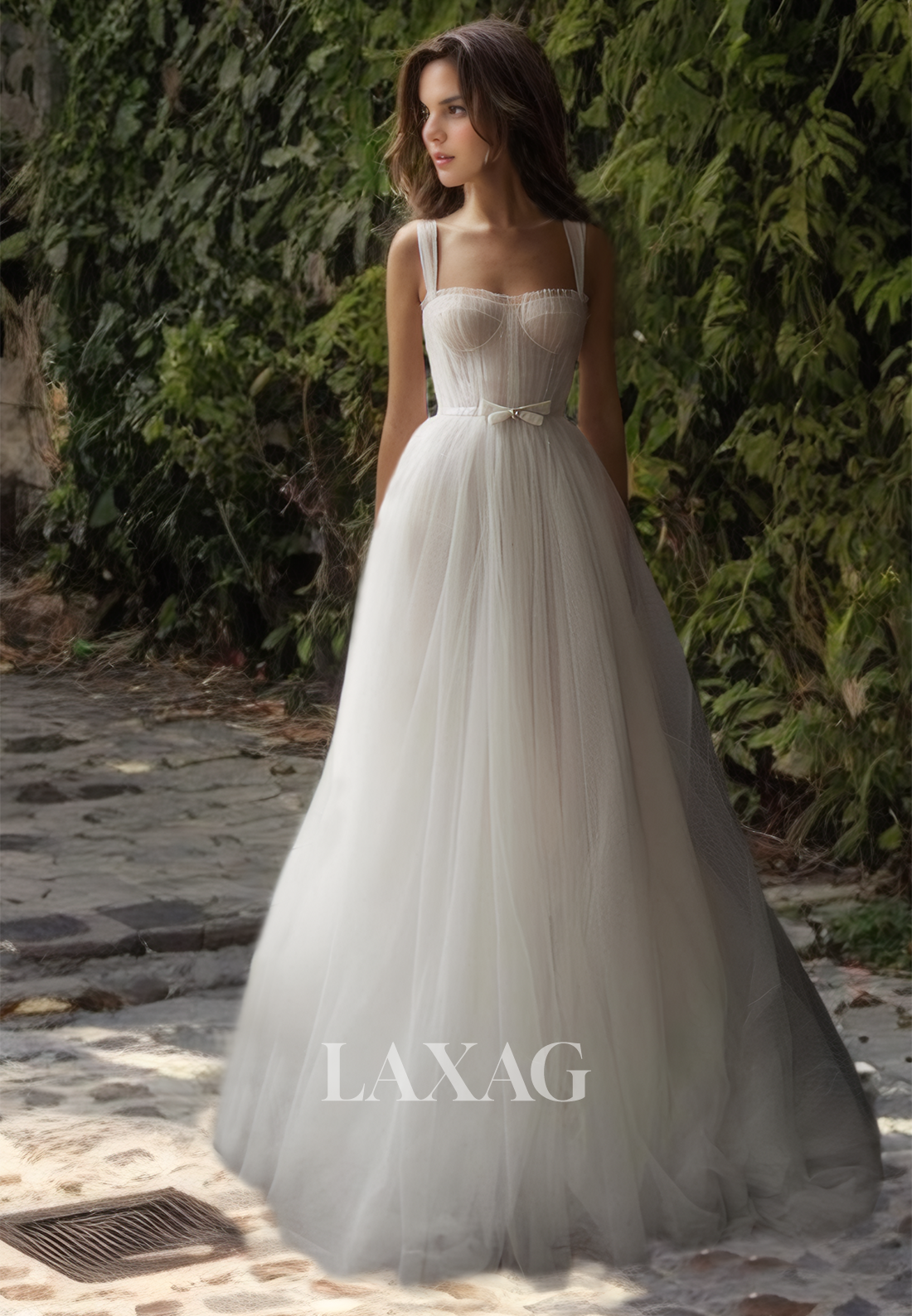 Square-Neck Spaghetti Straps Tulle A-Line Wedding Dress Pleated Boho Beach Bride Gowns with Train