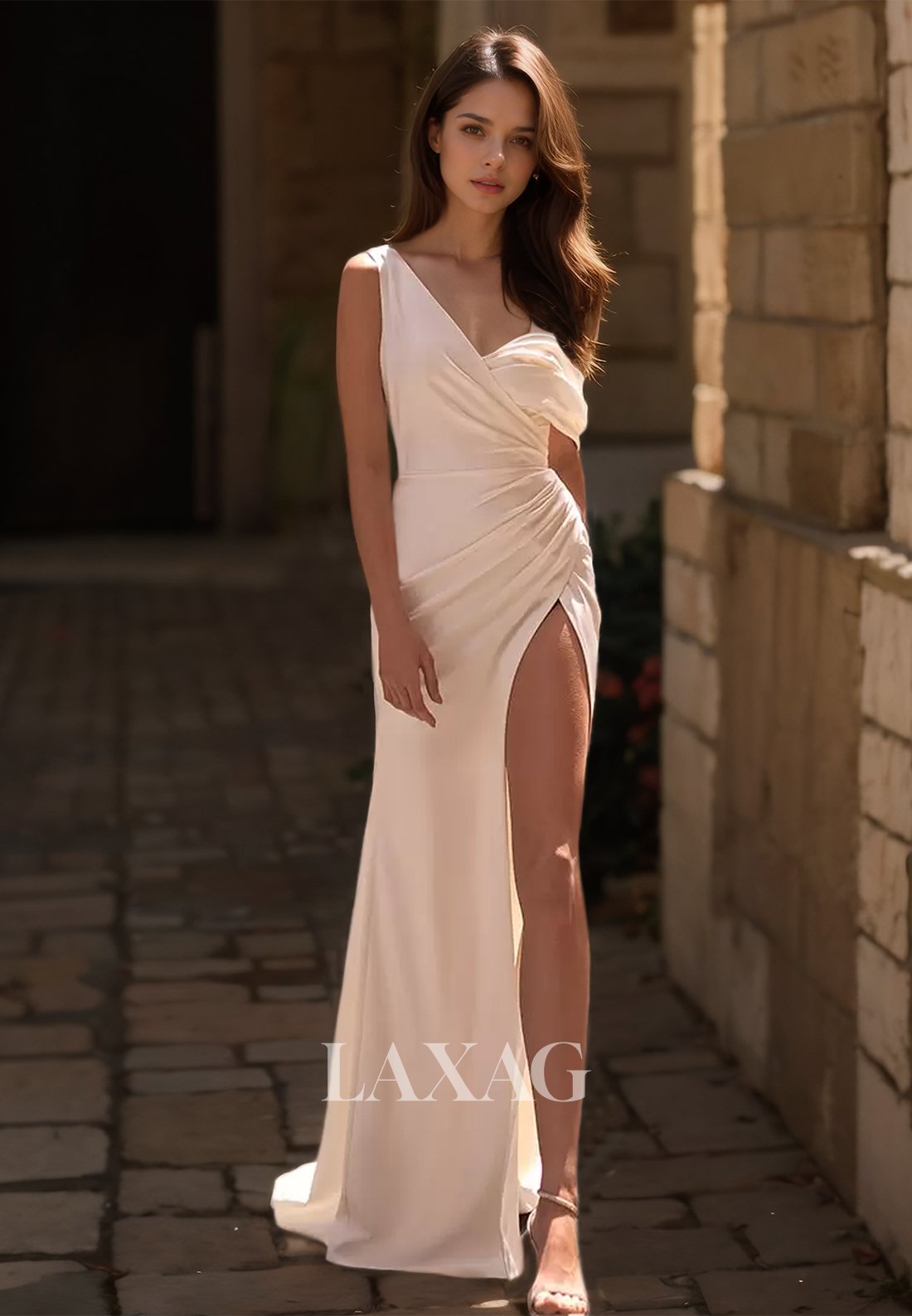 V-Neck Straps Sleeveless Bride Gowns Pleated Off-Shoulder Beaded High Slit Wedding Dress