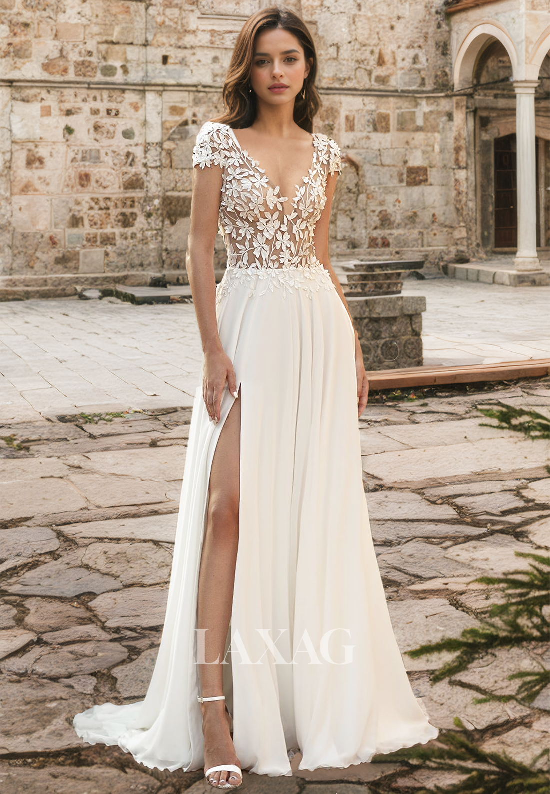 Effortlessly elegant, this A-Line wedding dress features short sleeves and a deep V-neck with intricate floral embellishments. The cutout back adds a touch of modernity, while the high slit allows for easy movement. Perfect for the stylish bride looking for a unique and stunning gown.