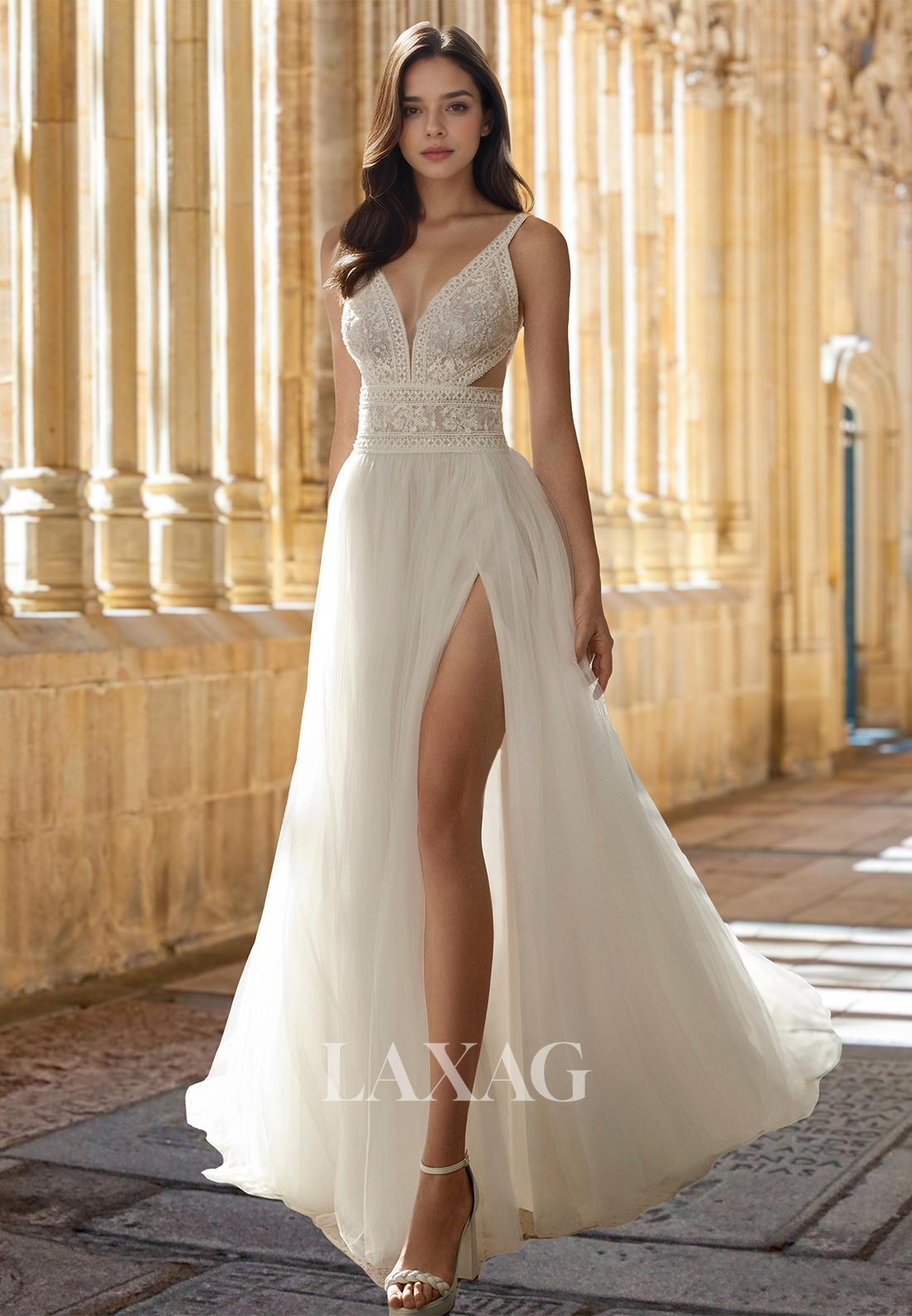 Spaghetti Straps Deep V-Neck Tulle A-Line Wedding Dress Beaded Lace Applique Cutout Bride Gowns