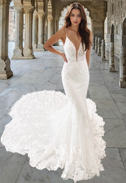 Deep V-Neck Spaghetti Straps Mermaid Wedding Dress Allover Lace Applique Bride Gowns with High Slit