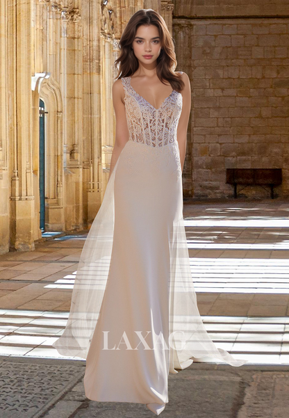 This elegant V-neck wedding dress features delicate straps and a sleeveless design, perfectly complemented by intricate lace applique and a satin mermaid silhouette. The added tulle overskirt adds a touch of romance and grace to this stunning gown.