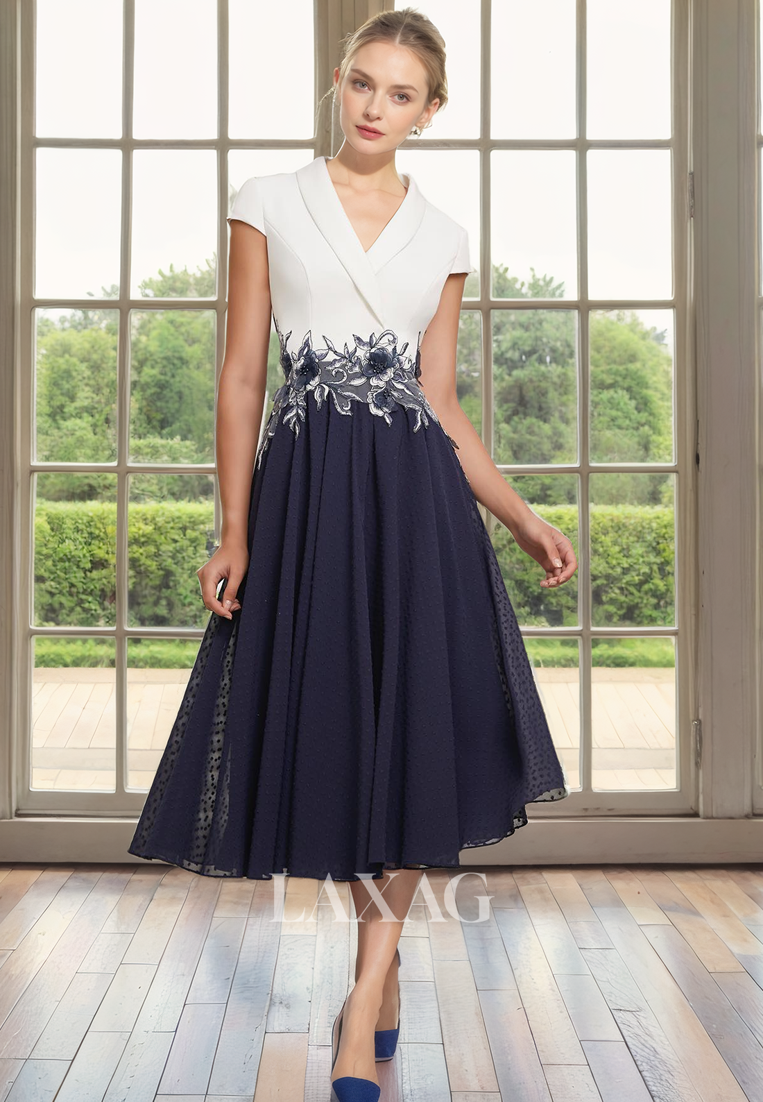 A-Line V-Neck Cap Sleeves Appliques Beaded Tulle Mother of the Bride Dress