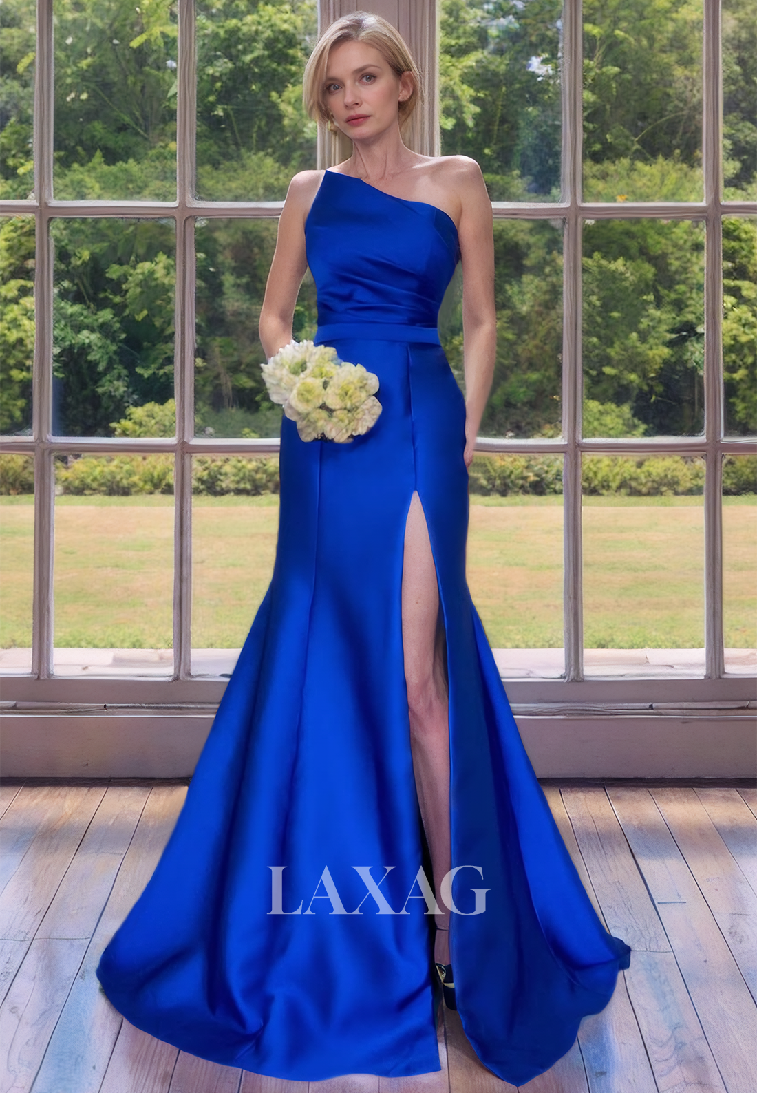 Asymmetrical-Neck Sleeveless Floor-Length Pleated Satin Mother of the Bride Dress with Slit