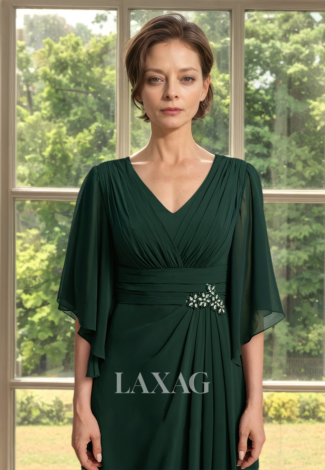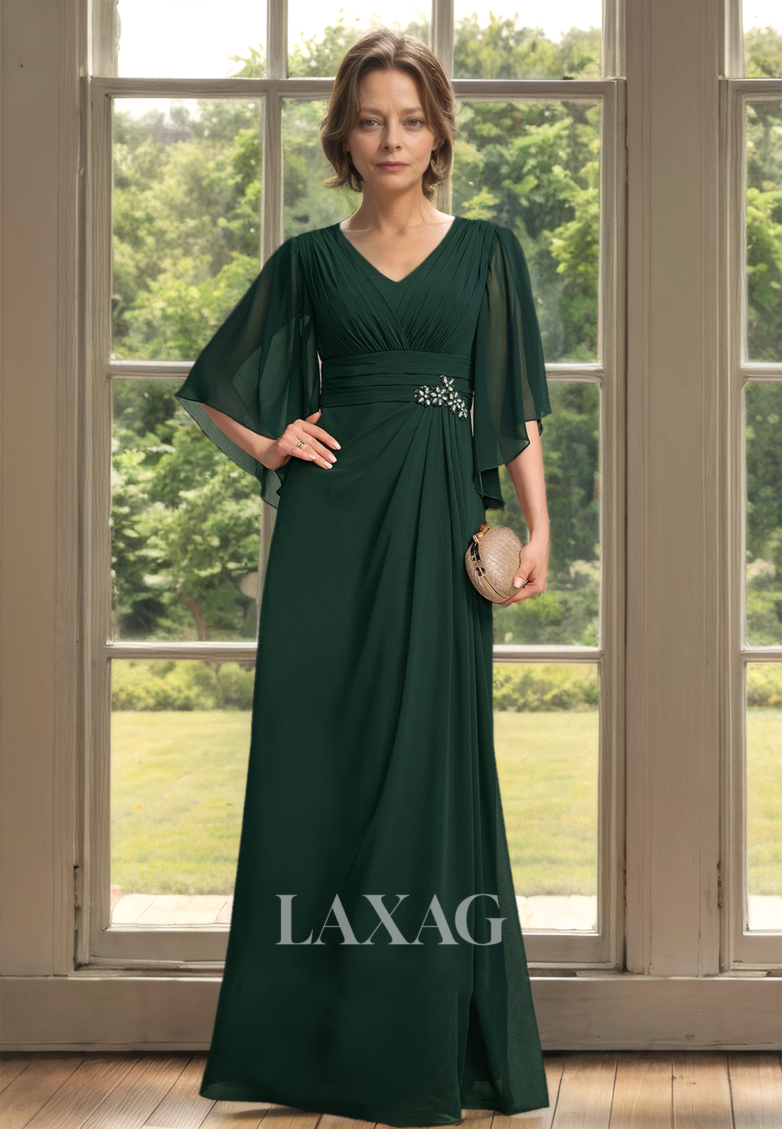 V-Neck Half-Sleeves A-Line Mother of the Bride Dress Pleated Beaded Floor-Length Cocktail Gowns
