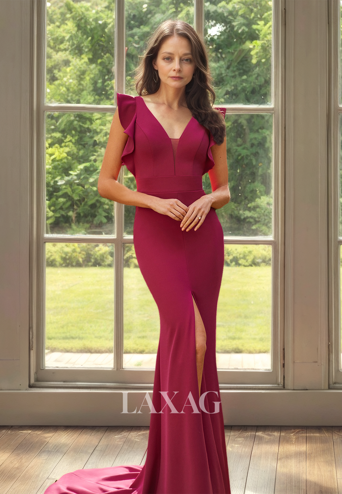 Elevate your elegance with our V-Neck Sleeveless Mermaid Mother of the Bride Dress. The ruffled design and high slit add a touch of glamour, while the mermaid silhouette flatters your figure. Perfect for a cocktail event, the train adds sophistication. Expertly crafted for mothers of the bride.