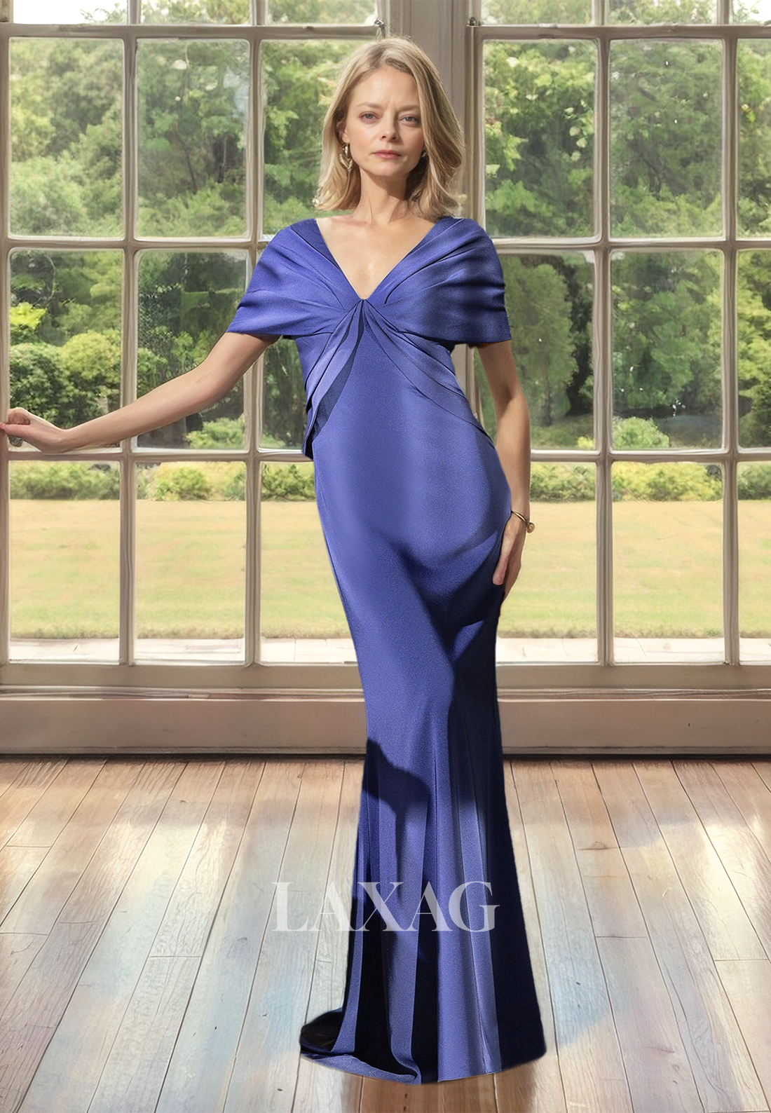 V-Neck Cap-Sleeves Pleated Satin Mother of the Bride Dress Floor-Length Mermaid Cocktail Gowns