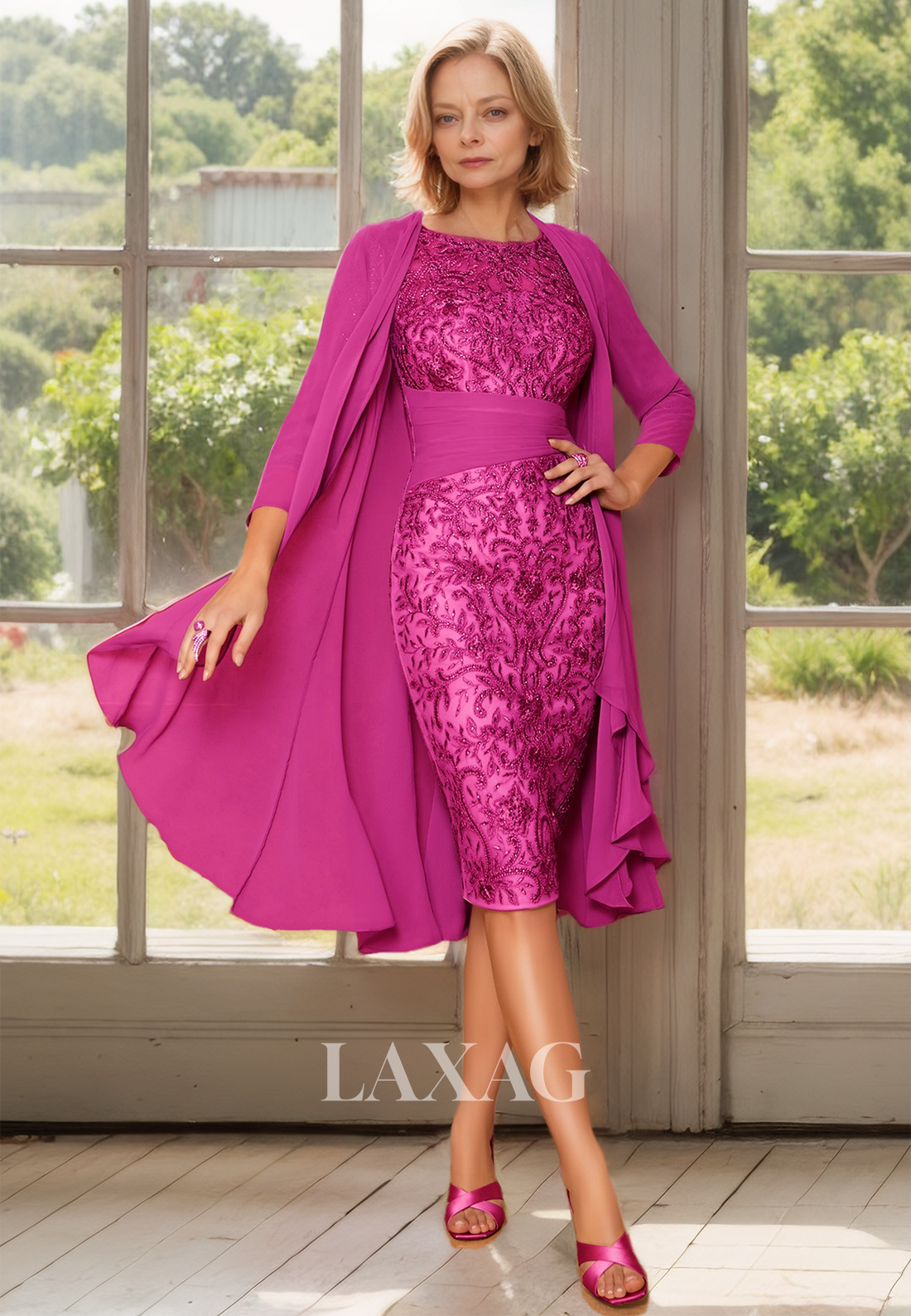 Elevate your look with our Scoop-Neck Half-Sleeves Beaded Mermaid Mother of the Bride Dress. With its stunning allover lace applique and beaded details, this dress is perfect for any cocktail occasion. The flattering scoop-neck and elegant mermaid silhouette are enhanced by a delicate overlay, creating a timeless and sophisticated look.