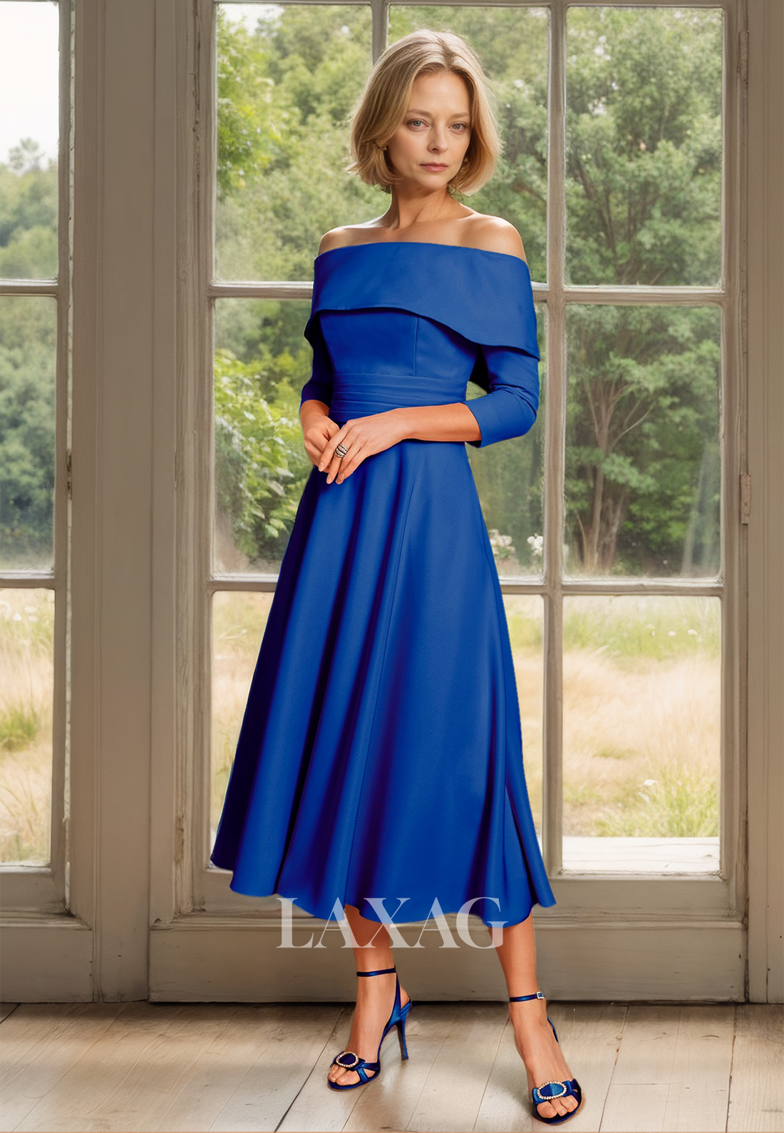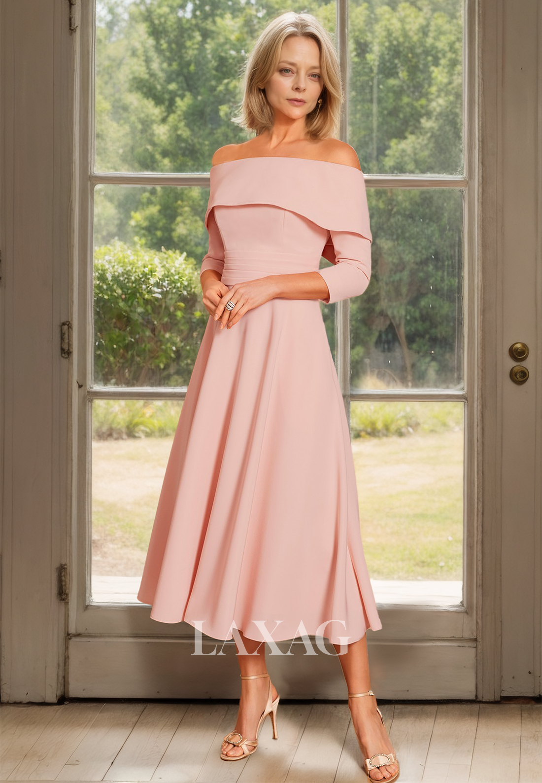 Tube Top Long-Sleeves Chiffon Pleated Cocktail Gowns Off-Shoulder Midi Mother of the Bride Dress