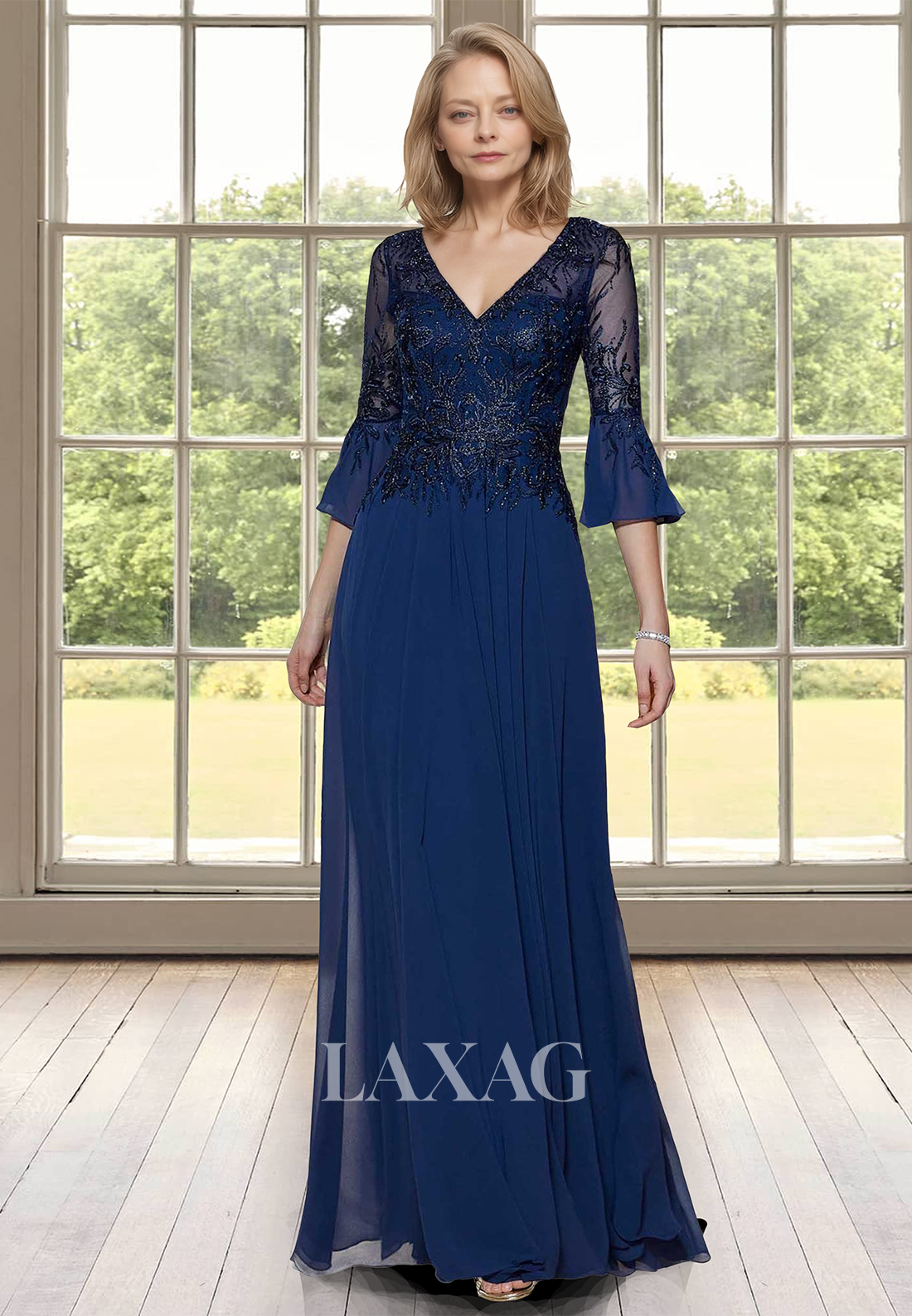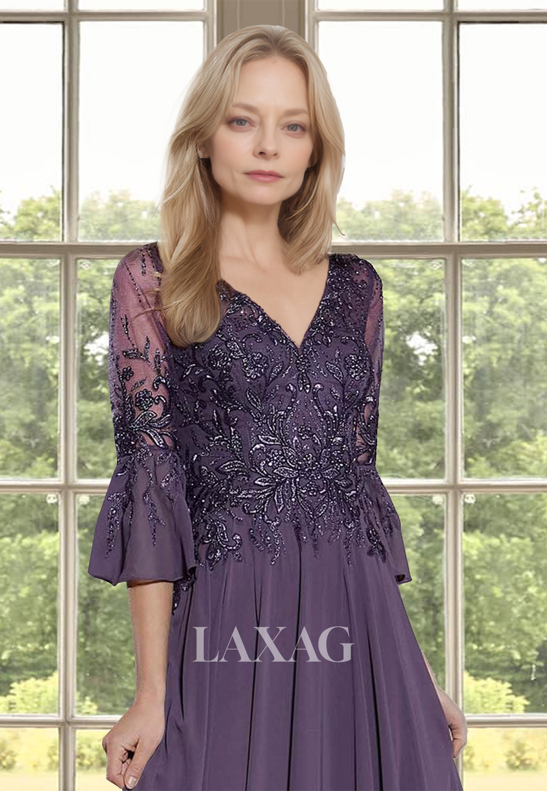 V-Neck Half-Sleeves Pleated Cocktail Gowns Beaded Glitter Applique A-Line Mother of the Bride Dress