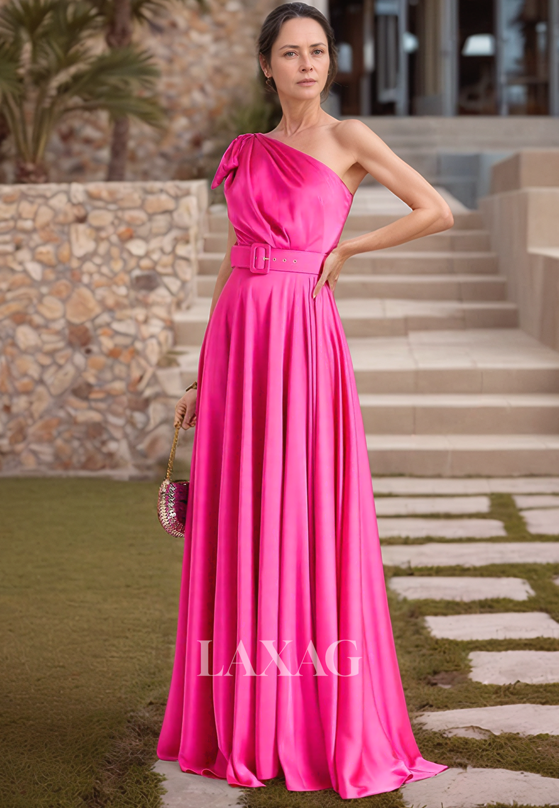 Asymmetrical-Neck Off-Shoulder Sleeveless Pleated Floor-Length Satin Fitted Mother of the Bride Dress