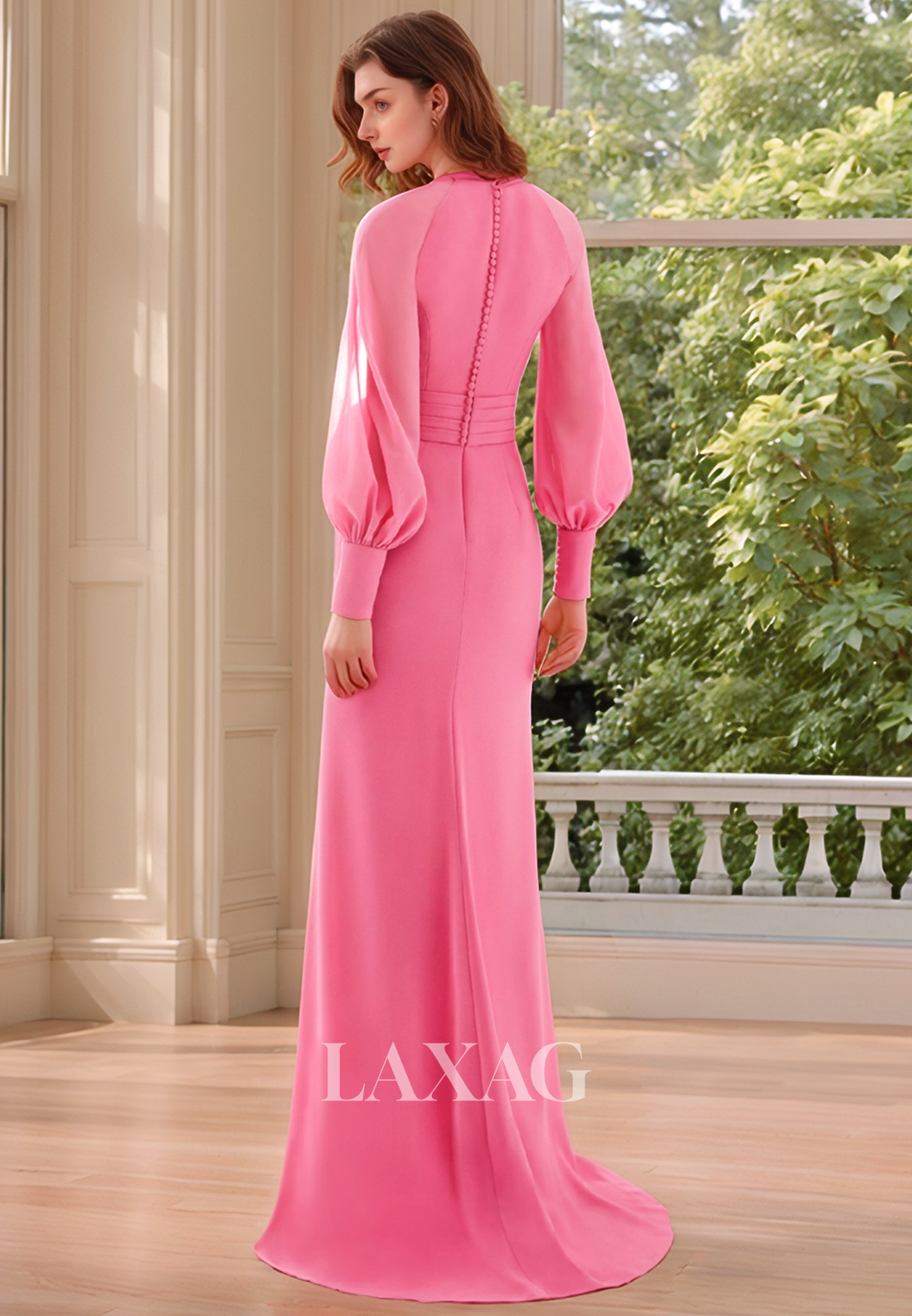 V-Neck Long-Sleeves Pleated Floor-Length Chiffon Mermaid Mother of the Bride Dress with High Slit