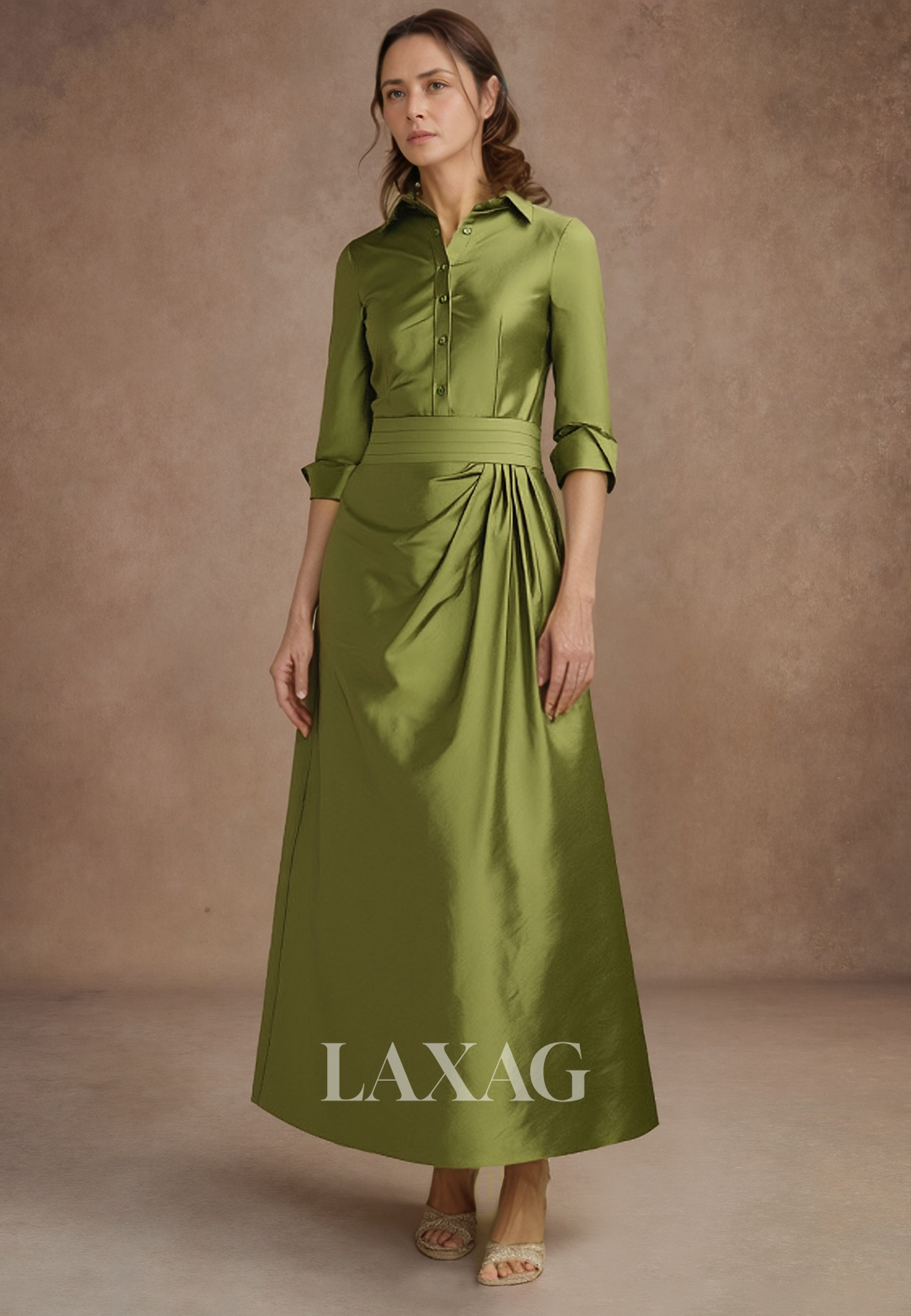 Long-Sleeves Ankle-Length Pleated Satin A-Line Formal Mother of the Bride Gowns