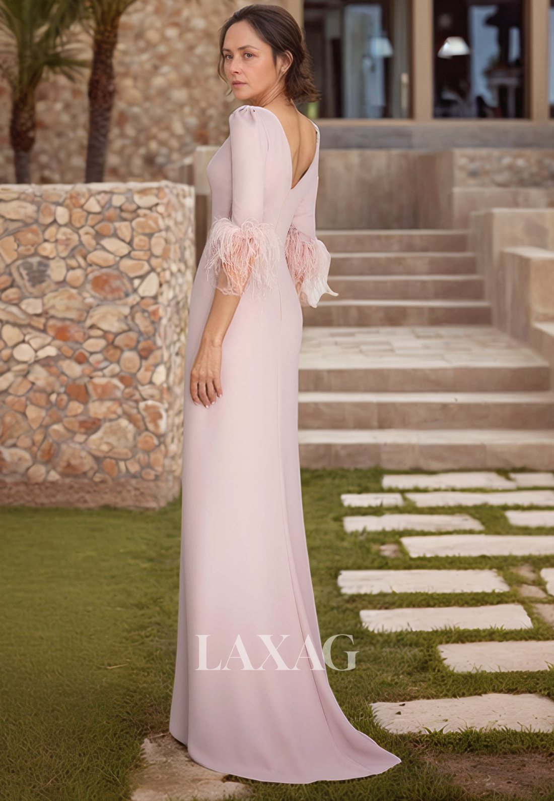 Feathered Half-Sleeves Pleated Cocktail Dress Scoop-Neck Floor-Length Fitted Mother of the Bride Gowns