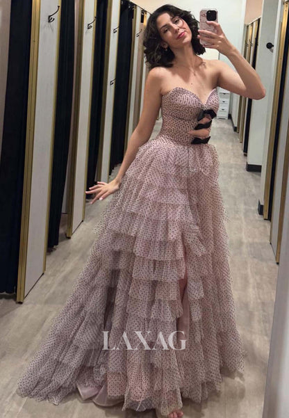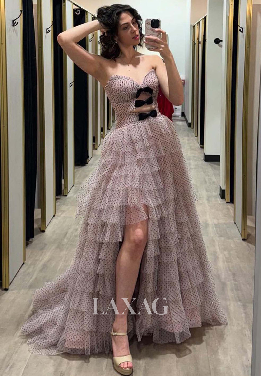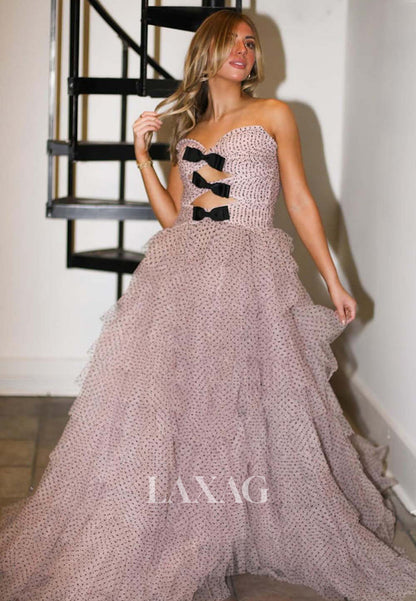 A-Line Sweetheart Off-Shoulder Sleeveless Prom Dress Pleated Tiered Tulle Evening Gowns with Bows