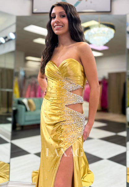 Off-Shoulder Sweetheart Sleeveless Mermaid Prom Dress Beaded Pleated Cutout Evening Gowns with Slit