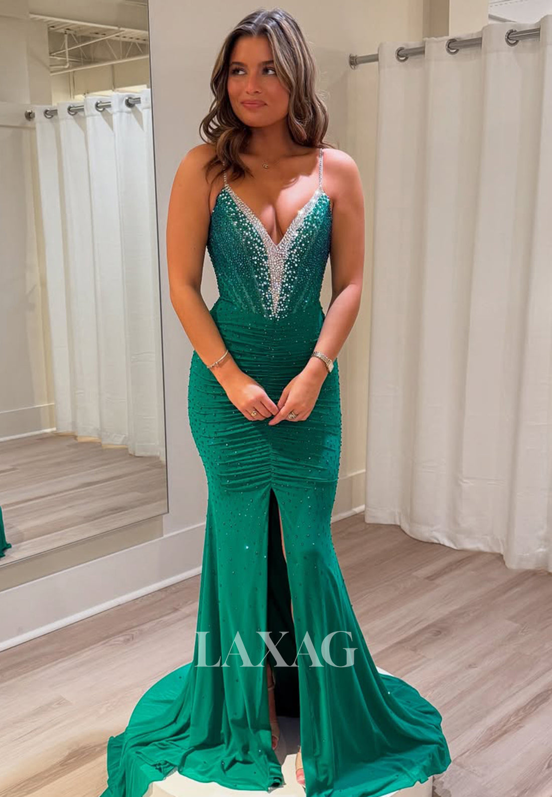 V-Neck Spaghetti Straps Off-Shoulder Sleeveless Beaded Pleated Satin Sweep Train Mermaid Prom Dress