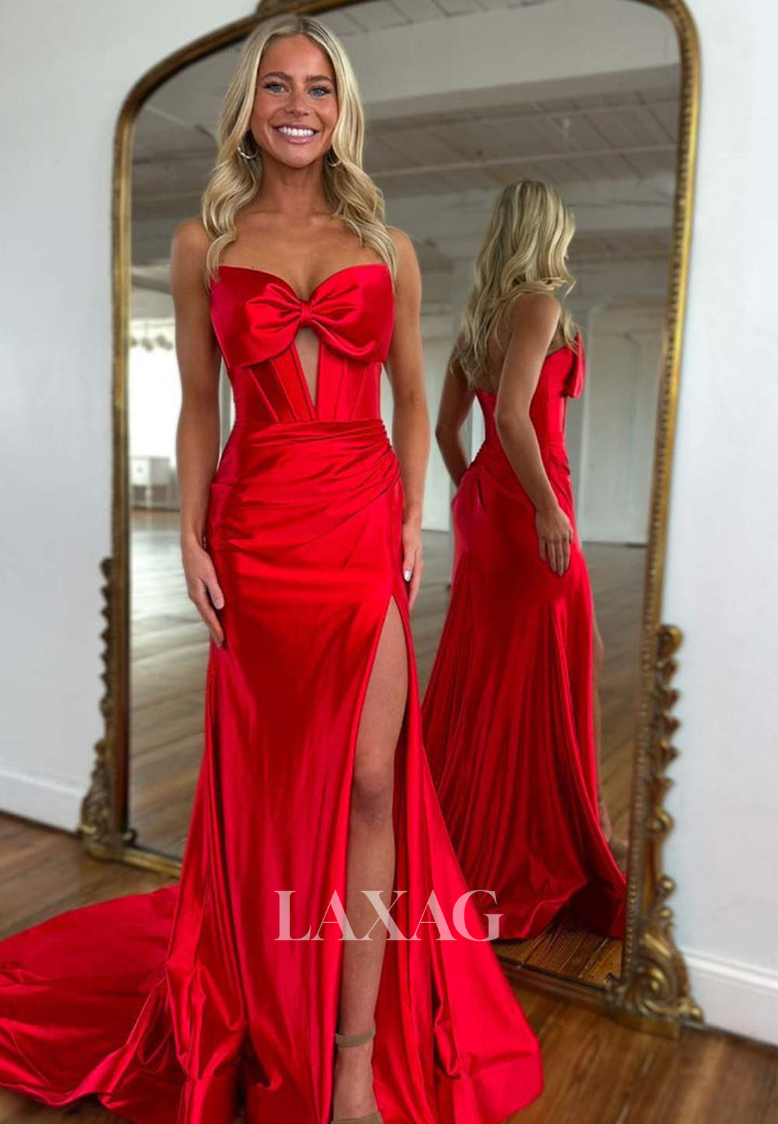 Bow-Sweetheart Sleeveless Mermaid Prom Dress Off-Shoulder Pleated Satin Formal Gowns with Sweep Train
