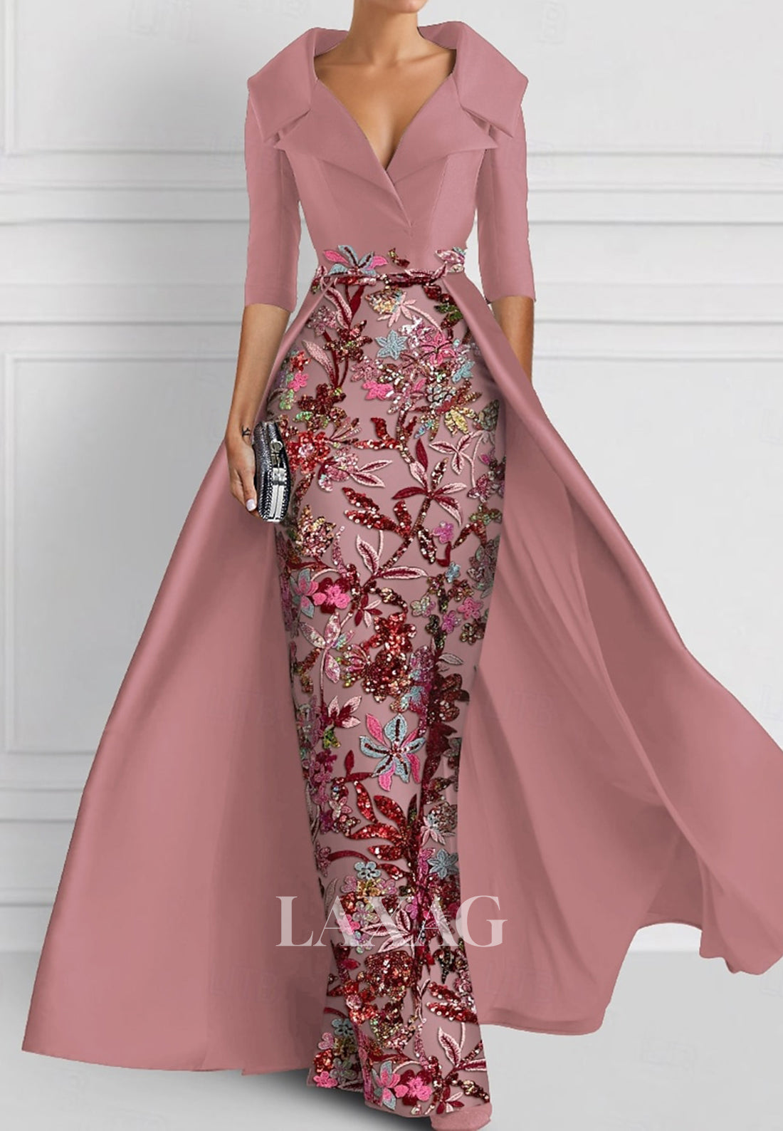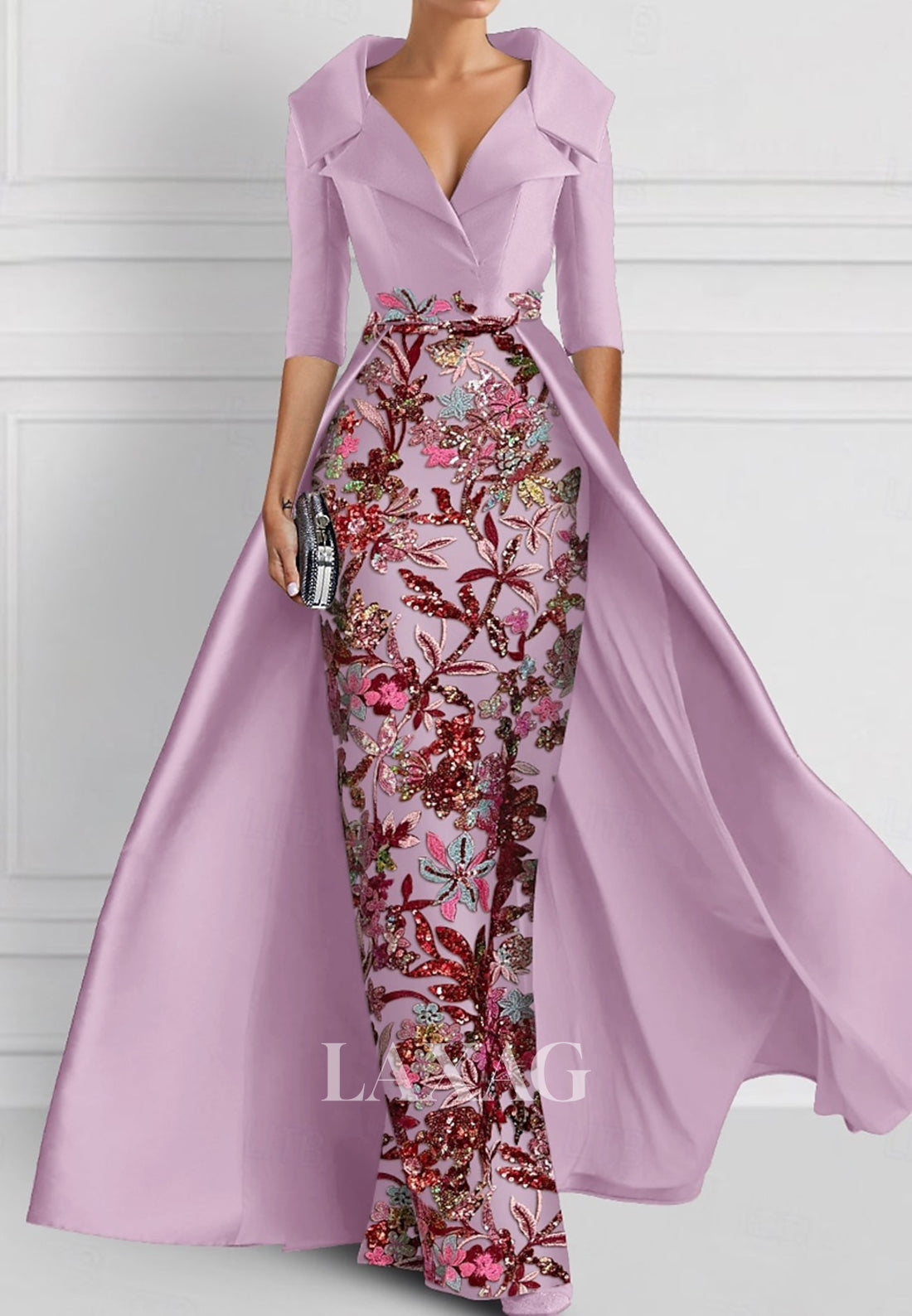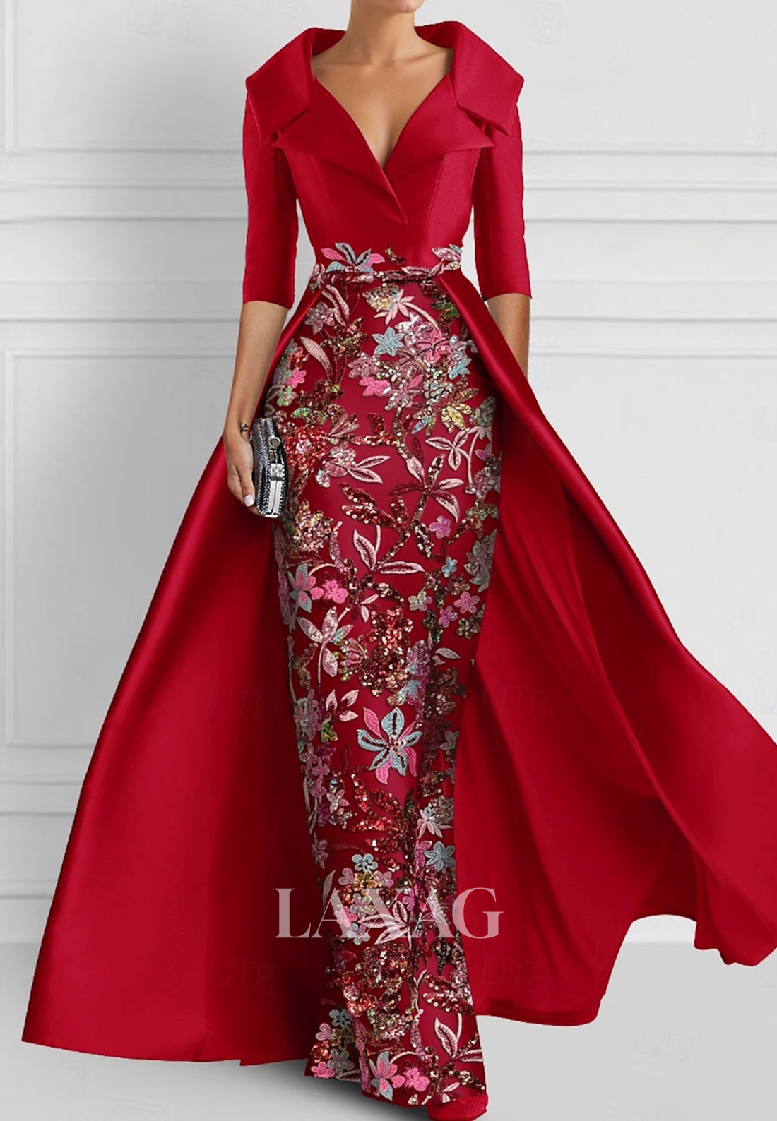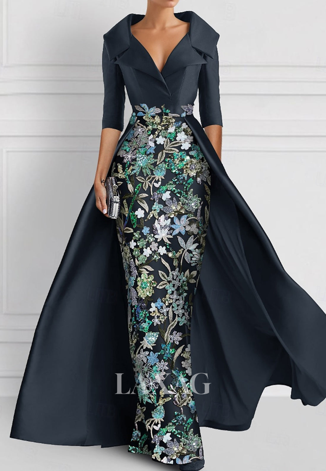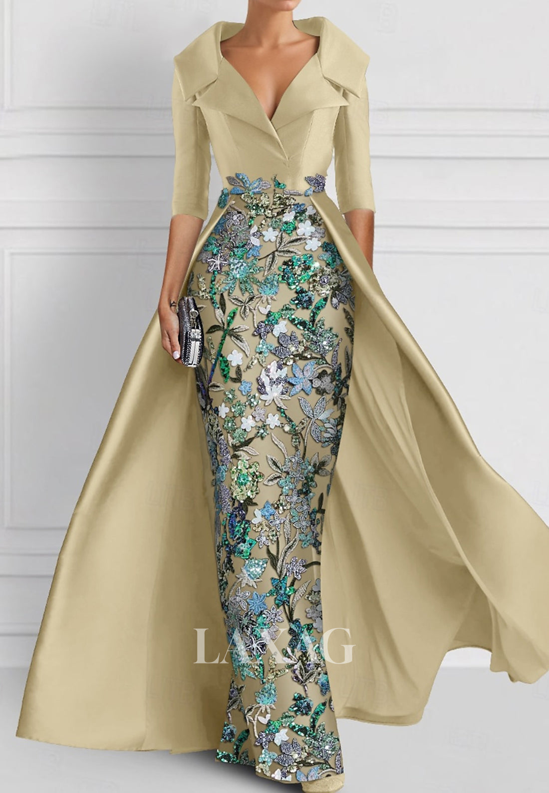 Enhance your wedding guest attire with our stunning V-Neck Half-Sleeves Pleated Party Gowns. Adorned with intricate applique embroidery, this mermaid style dress exudes elegance. The included overskirt adds a touch of glamour, perfect for any special occasion. Elevate your style and confidently make a statement in this gorgeous dress.