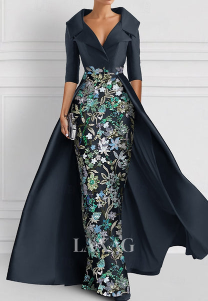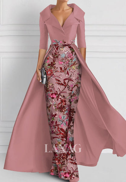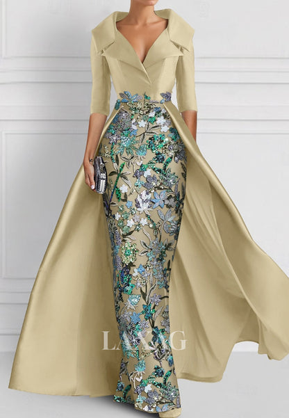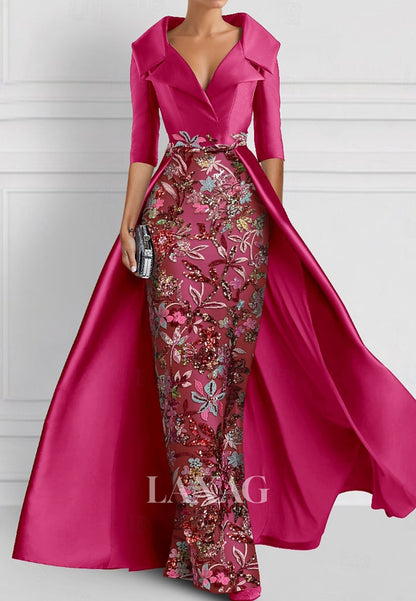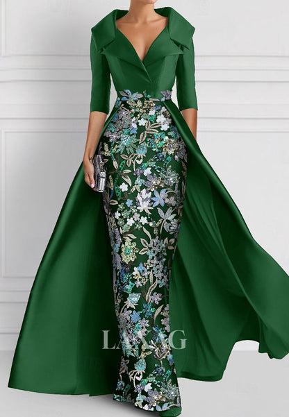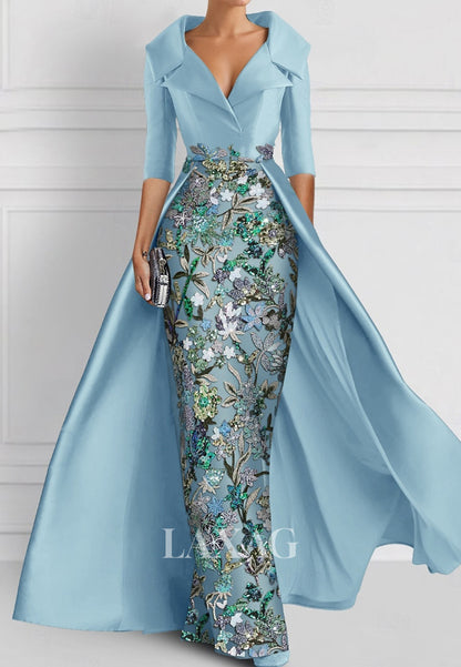 V-Neck Half-Sleeves Pleated Party Gowns Applique Embroidered Mermaid Wedding Guest Dress with Overskirt