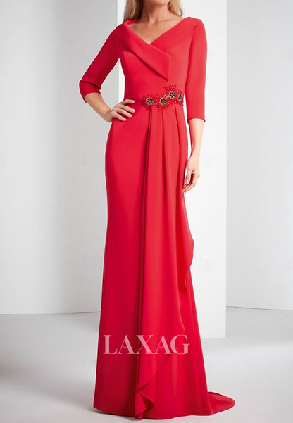 V-Neck Half-Sleeves Pleated Satin Party Gowns Beaded Rhinestone Fitted Wedding Guest Dress with Sweep Train