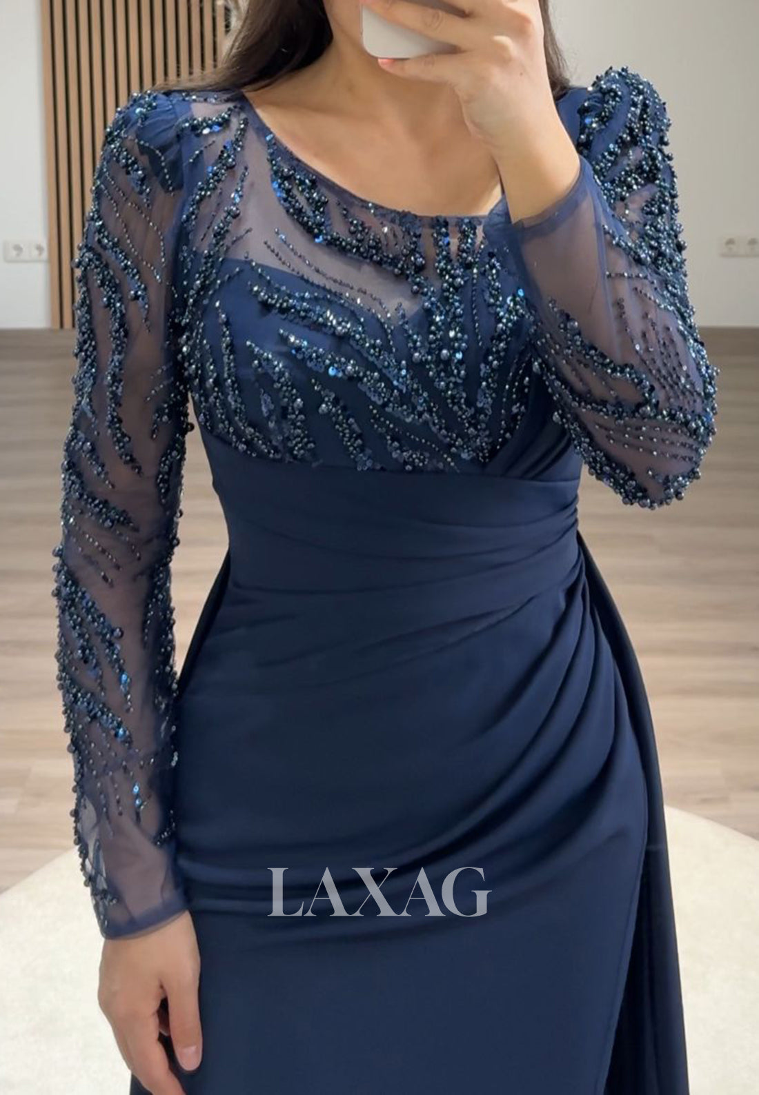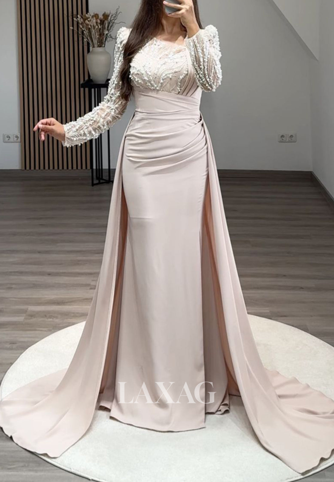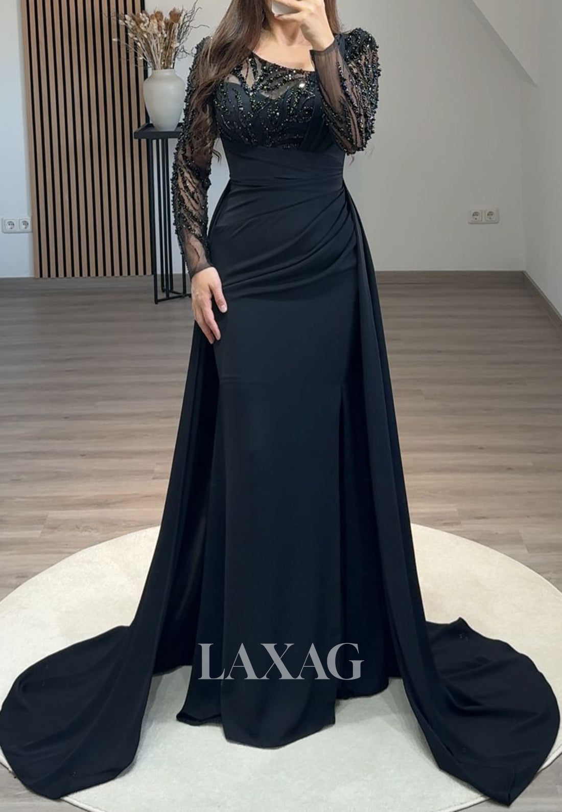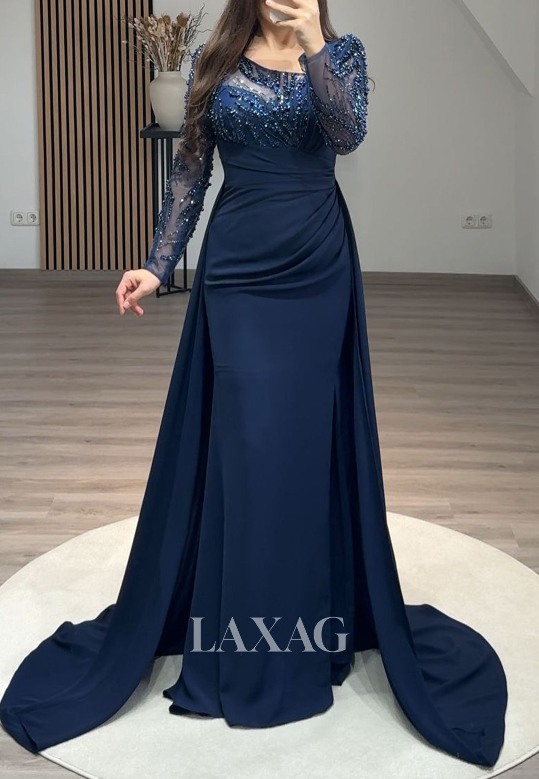 Long Sleeves Mother of the Bride Dress Beaded Sequined Pleated Satin Mermaid Evening Dress with Overskirt