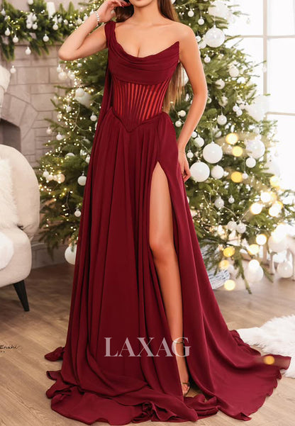 Scoop-Neck One-Strap Sleeveless A-Line Prom Dress Pleated Satin High Slit Sweep Train Evening Gowns