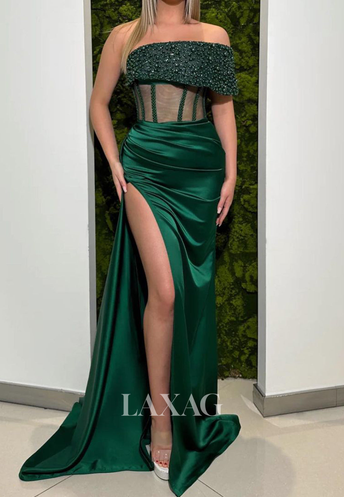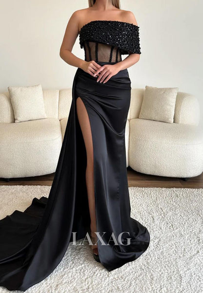 Off-Shoulder Tube Top Beaded Pleated Satin Party Gowns Sleeveless High Slit Mermaid Prom Dress
